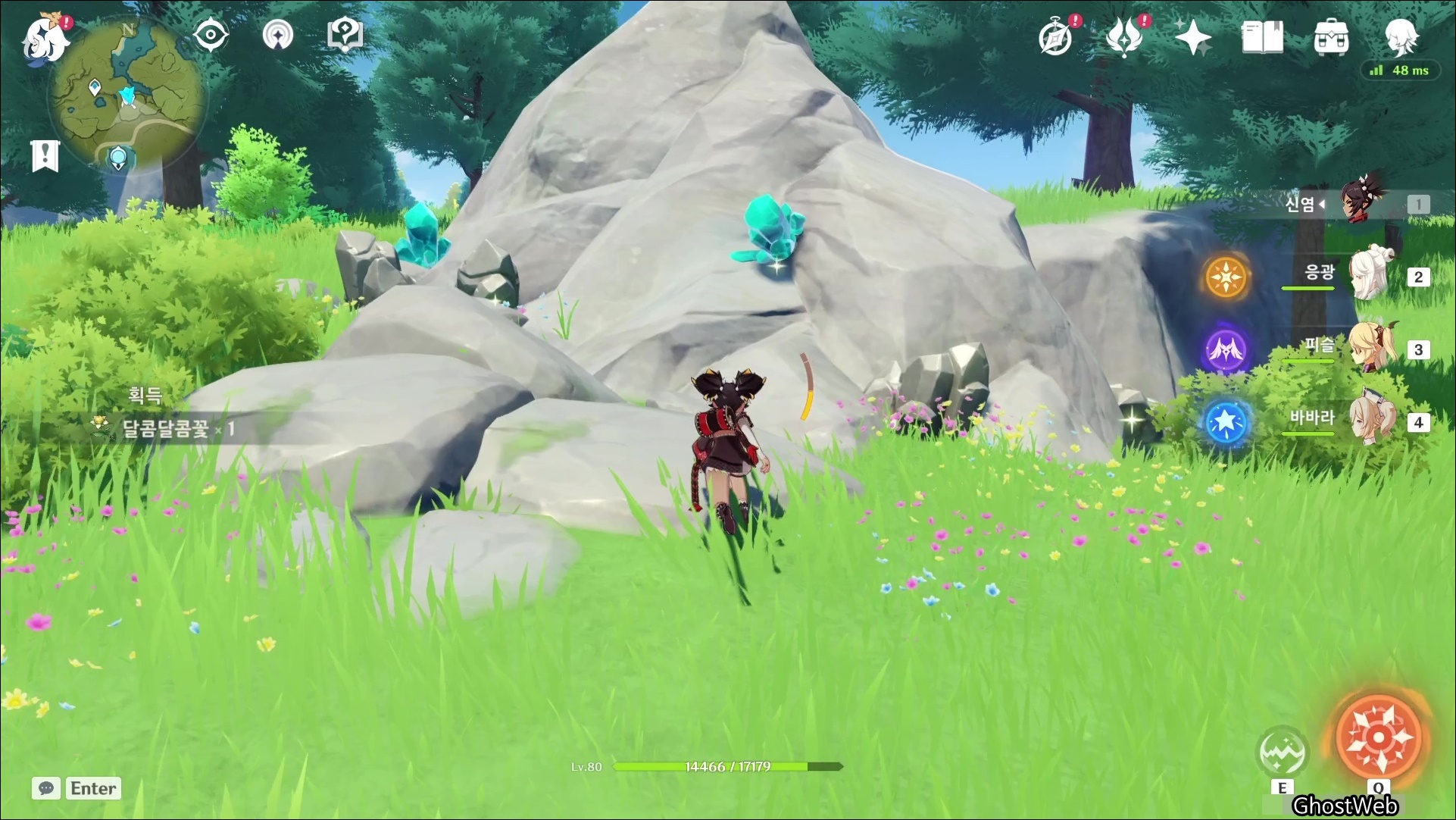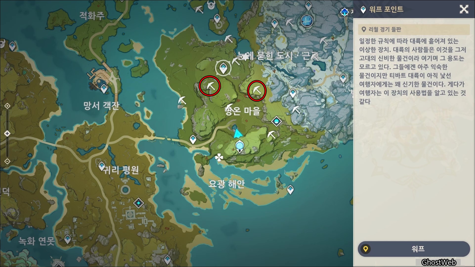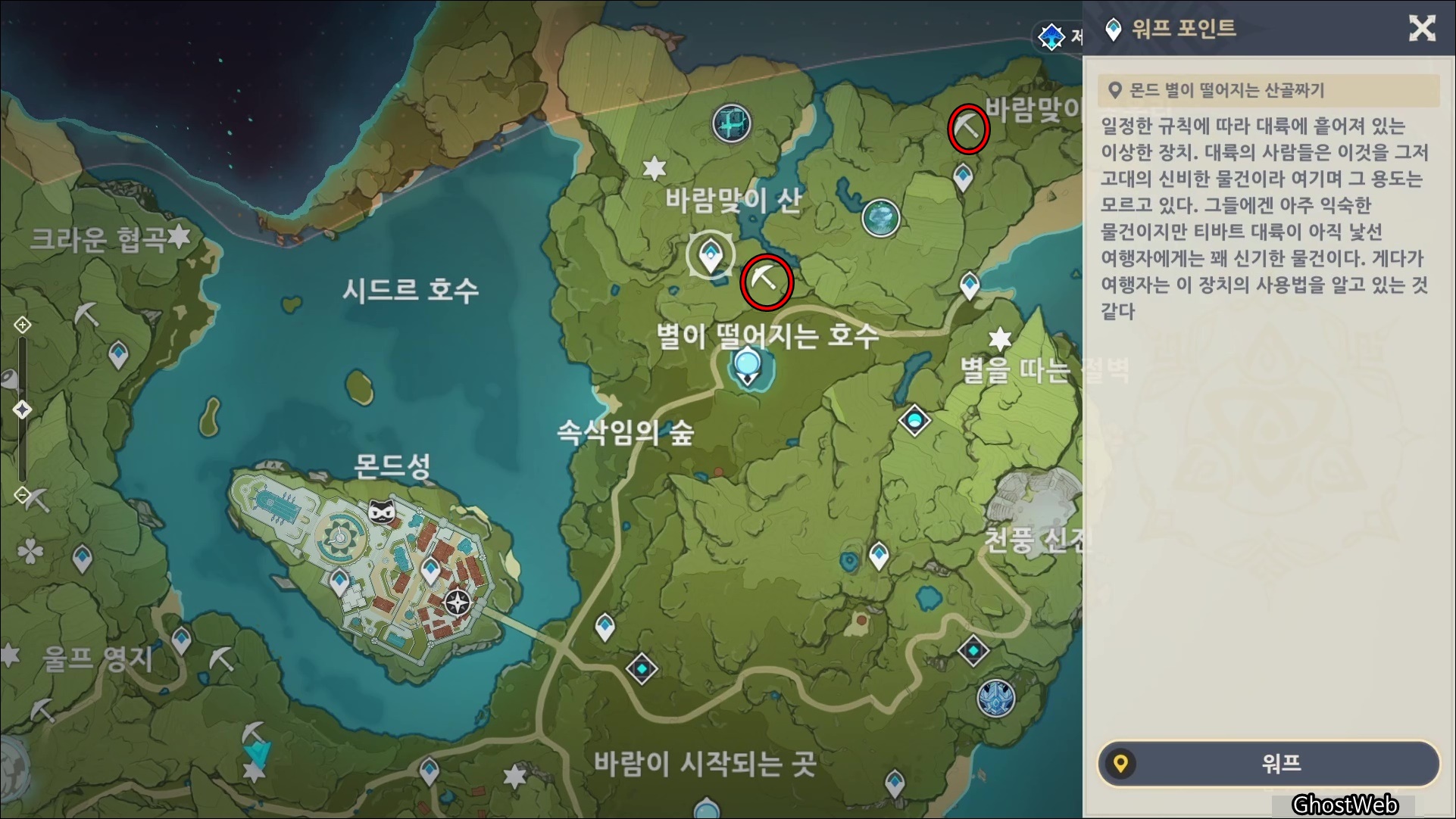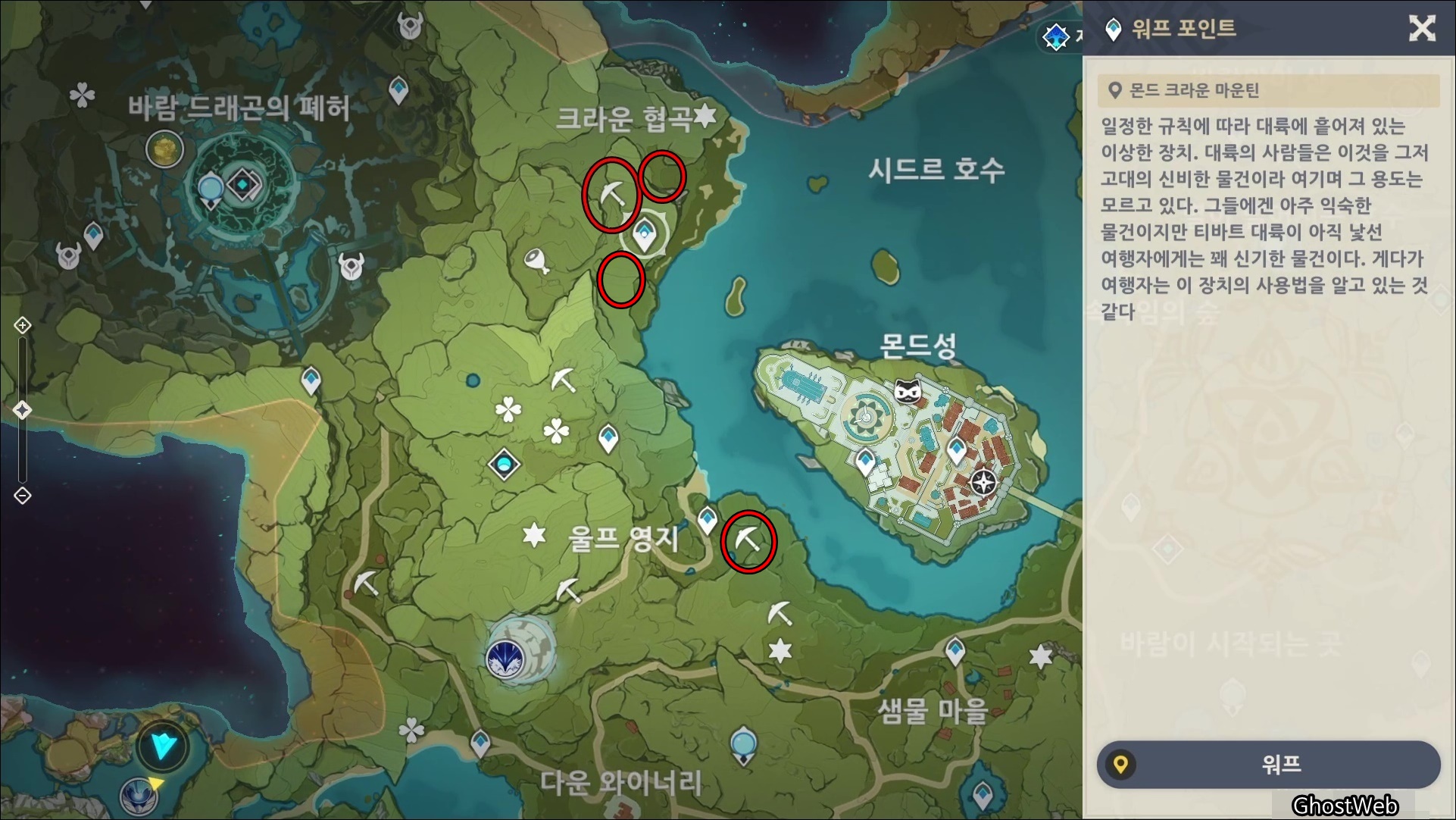 몬드성 1시 방향에 있는 바람맞이 봉우리 워프 포인트로 이동하여 12시 방향에 있는 큰 돌 주변에 백철, 수정덩이가 모여 있는 곳을 찾을 수 있어요.
