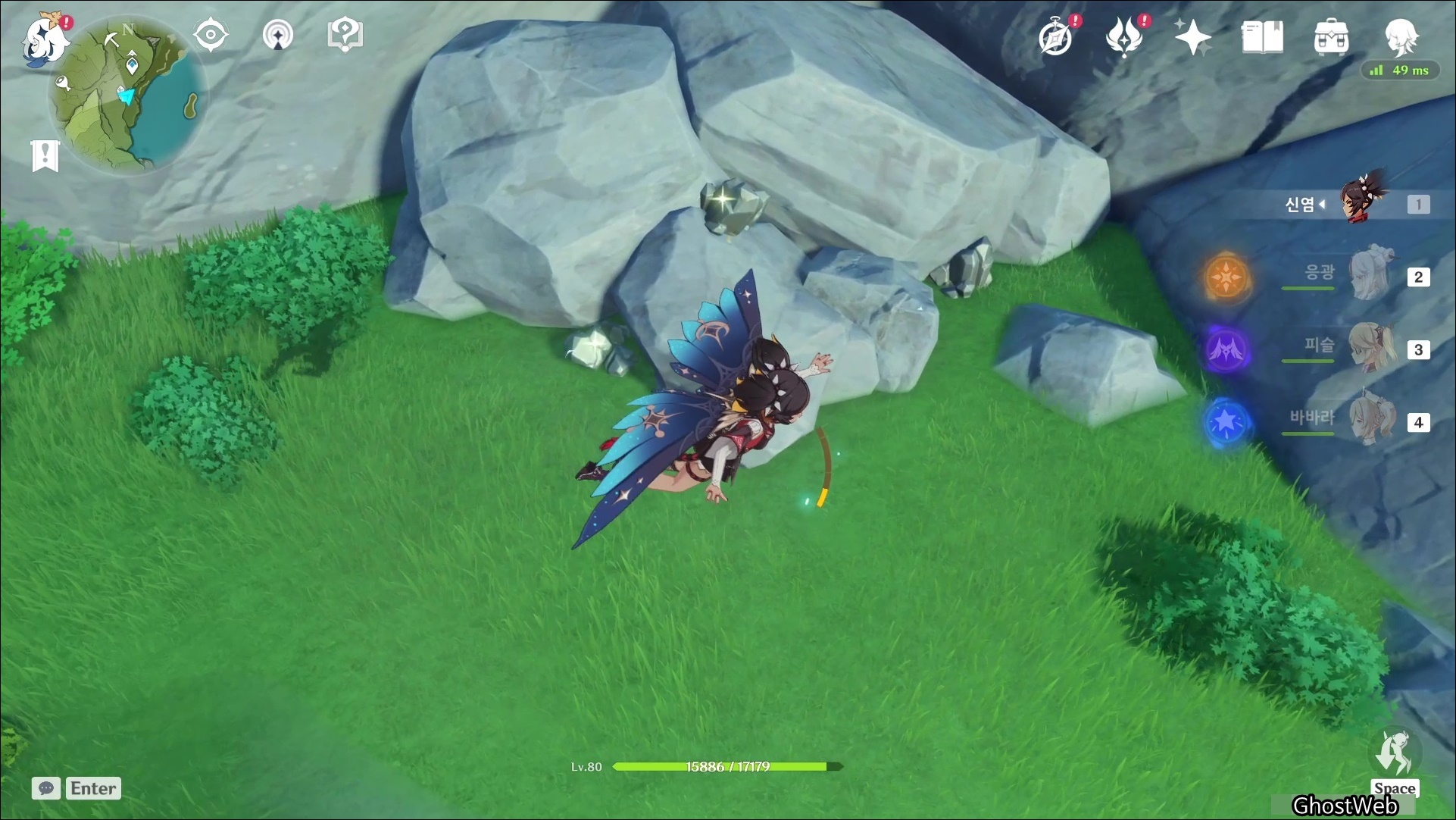 몬드성 1시 방향에 있는 바람맞이 산 워프 포인트로 이동하여 5시 방향에 큰 돌 주변에 백철, 수정덩이가 모여 있는 곳을 찾을 수 있어요.
