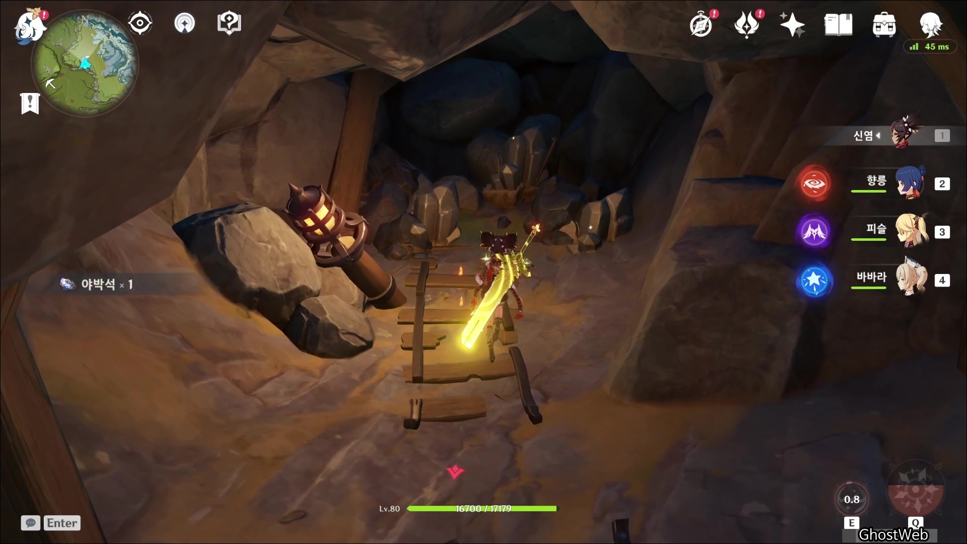 바위 속성 캐릭터(종려, 응광)가 있으면 광물을 속 쉽게 깰 수 있으며, 만약에 바위 속성 캐릭터가 없으신 분은 양손검을 사용하는 캐릭터로 광물을 깨면 돼요. (※ 전기 수정은 불 원소 캐릭터/공격으로 파괴 가능)