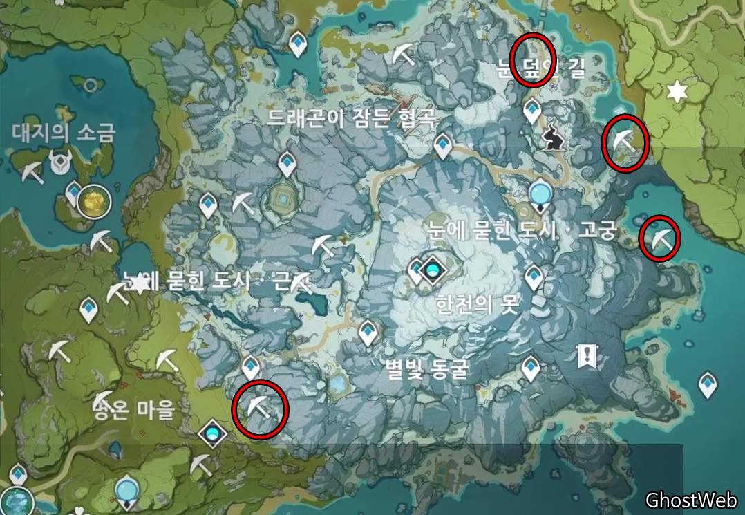 눈 덮인 길 워프 포인트 12시 방향 산 지역에서 성은 광석을 얻을 수 있어요.