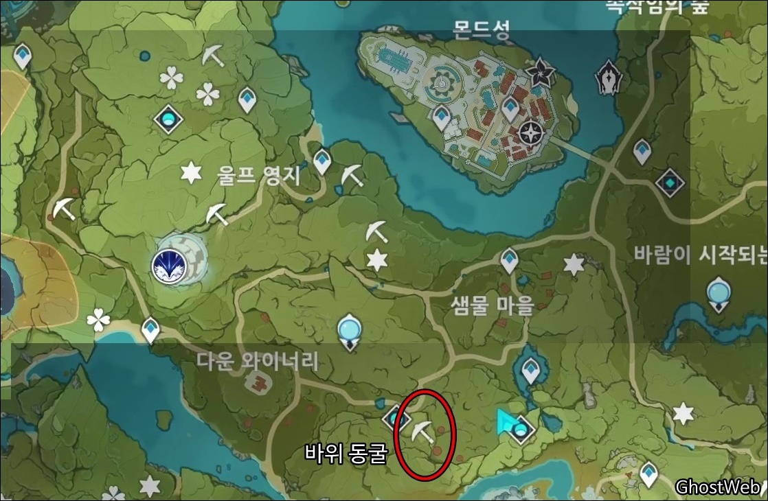 샘물 마을 아래에 있는 비경 사이에 있는 츄츄족 야영지 뒤에 있는 바위 동굴에서 수정덩이를 얻을 수 있어요.