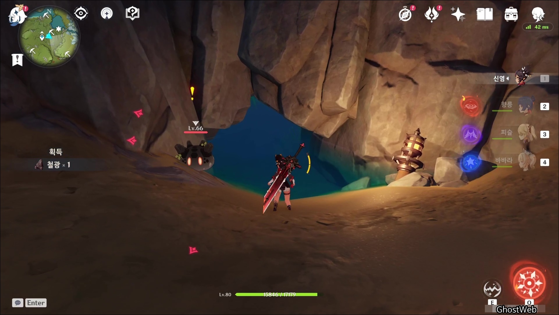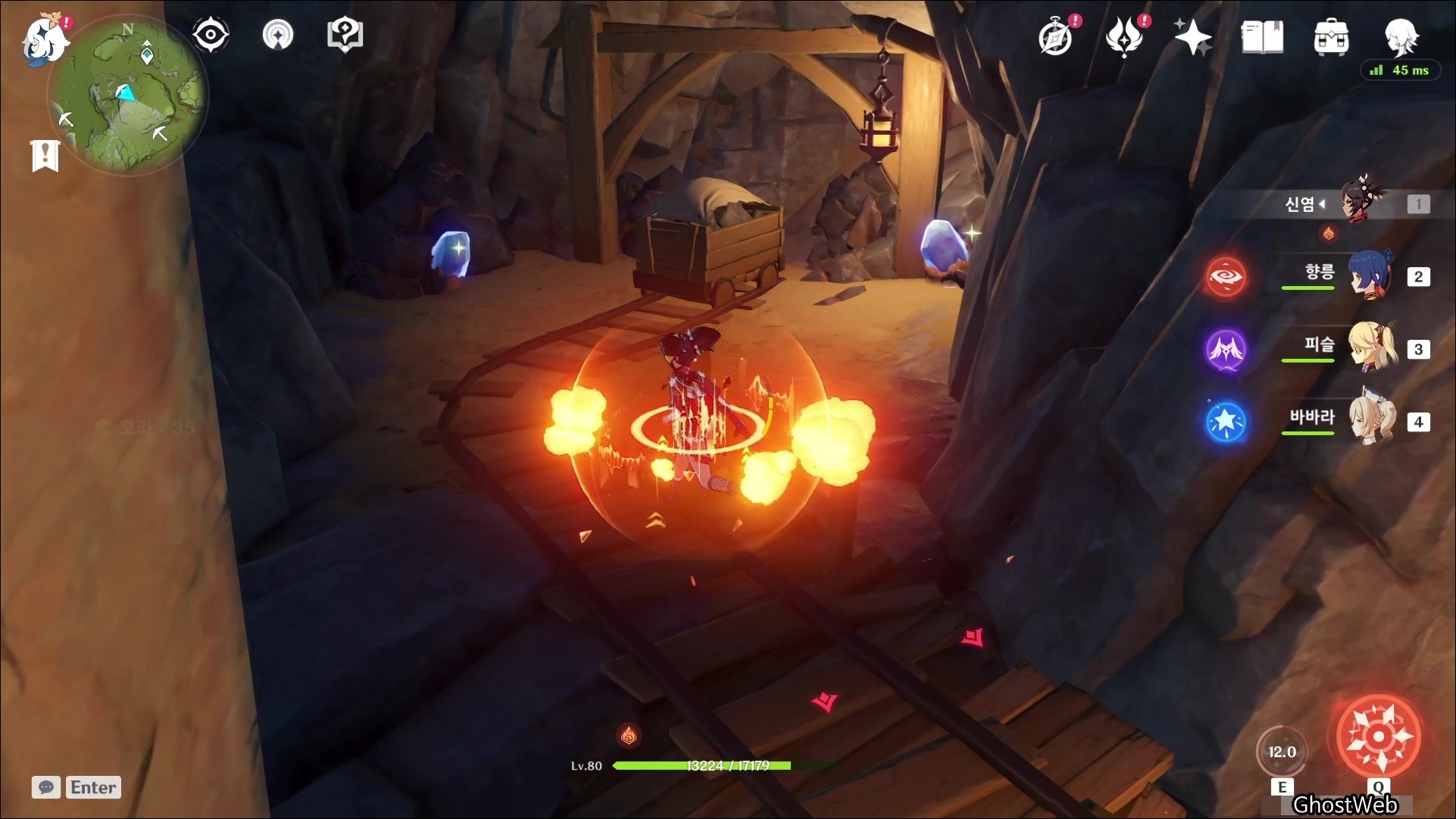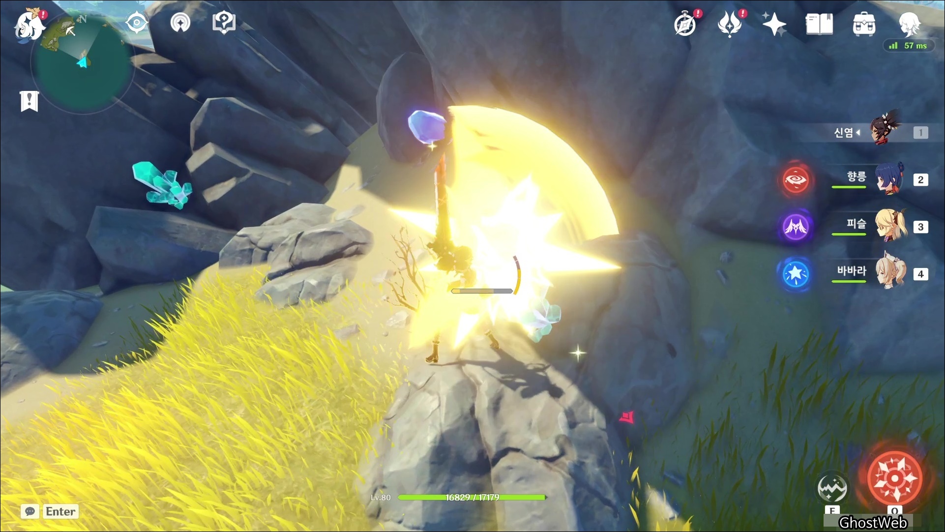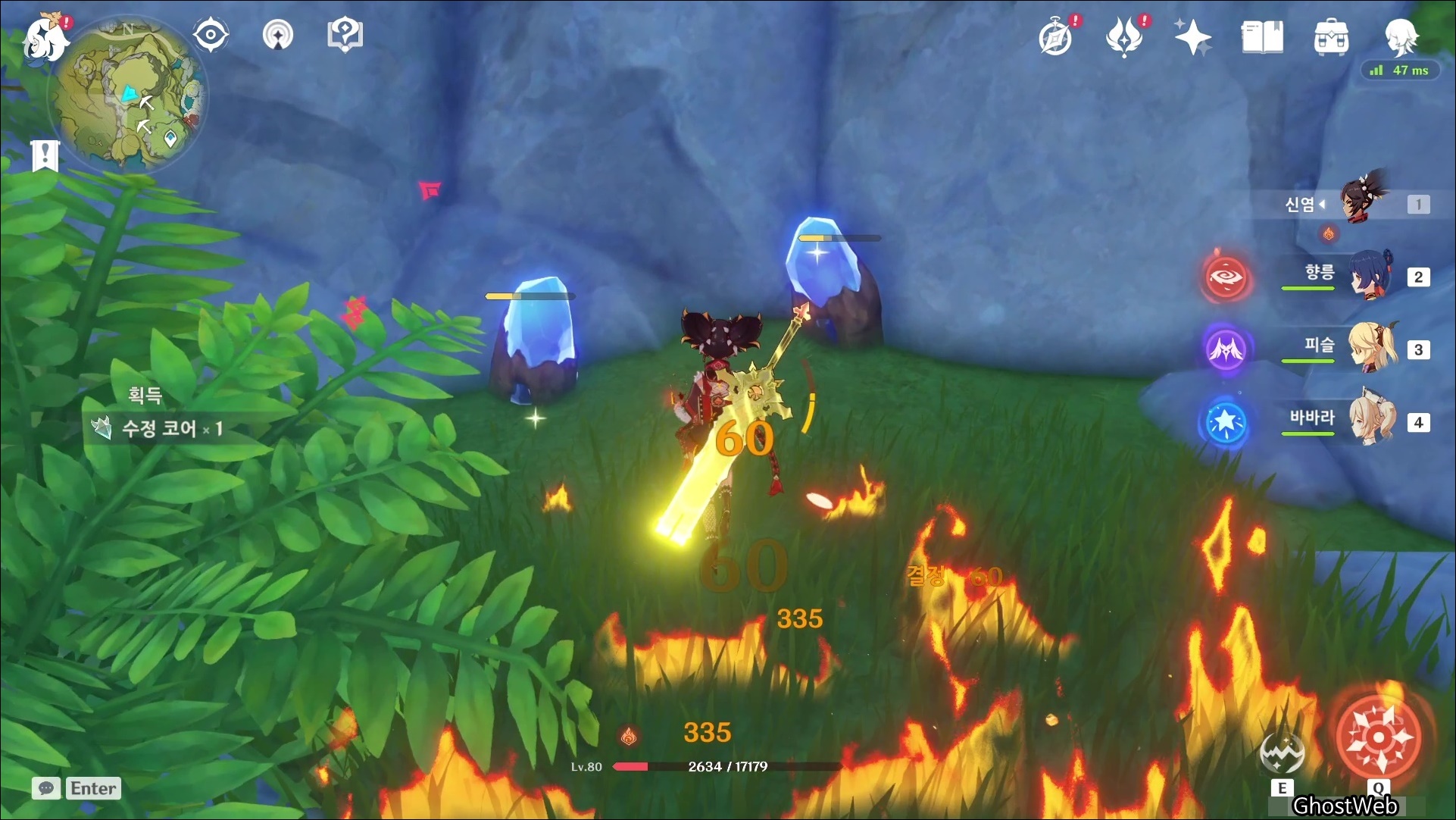 바위 속성 캐릭터(종려, 응광)가 있으면 광물을 속 쉽게 깰 수 있으며, 만약에 바위 속성 캐릭터가 없으신 분은 양손검을 사용하는 캐릭터로 광물을 깨면 돼요. (※ 전기 수정은 불 원소 캐릭터/공격으로 파괴 가능)