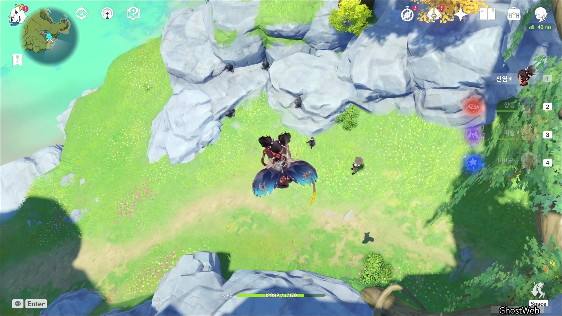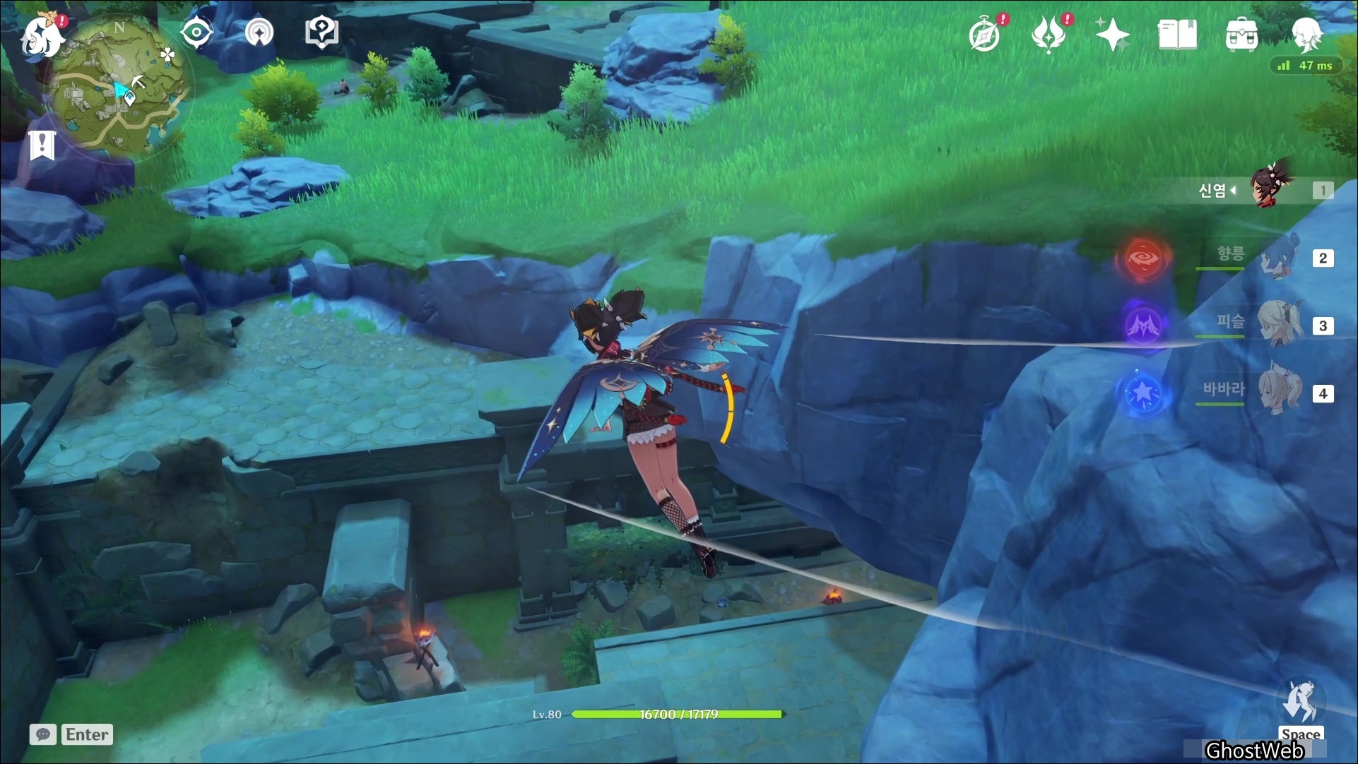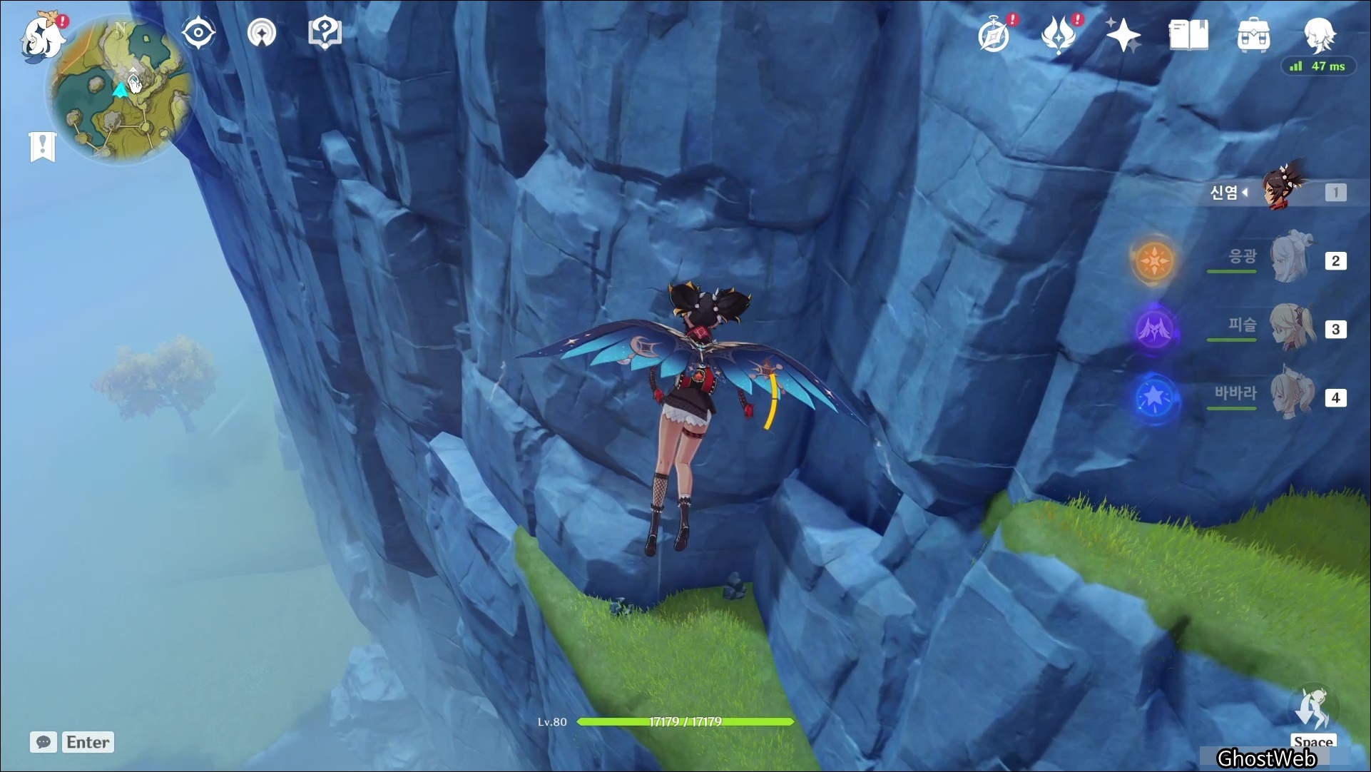 무망의 언덕 밑에 있는 워프 포인트에서 9시 방향으로 비행하다 보면 아래에 있는 바위 동굴에서 철광, 야박석, 콜 피라스 등을 얻을 수 있어요.