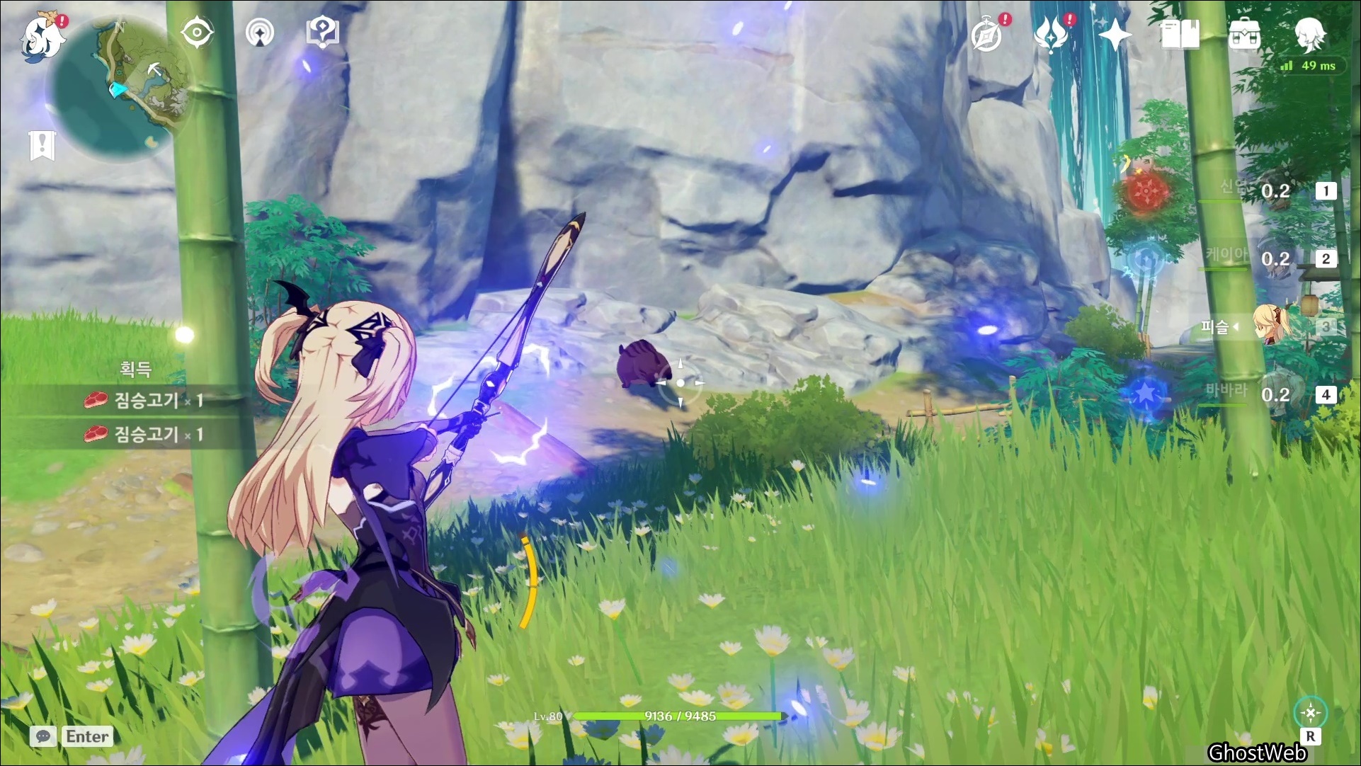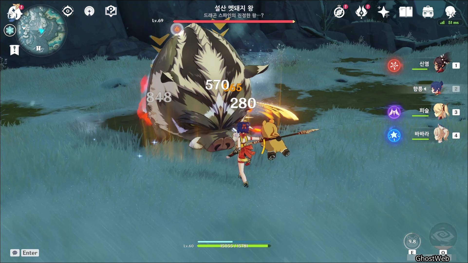 이 멧돼지를 불 원소 캐릭터의 불 원속 공격을 하면 멧돼지가 돌진하는데 이를 처치하면 냉동 생고기를 얻을 수 있어요.