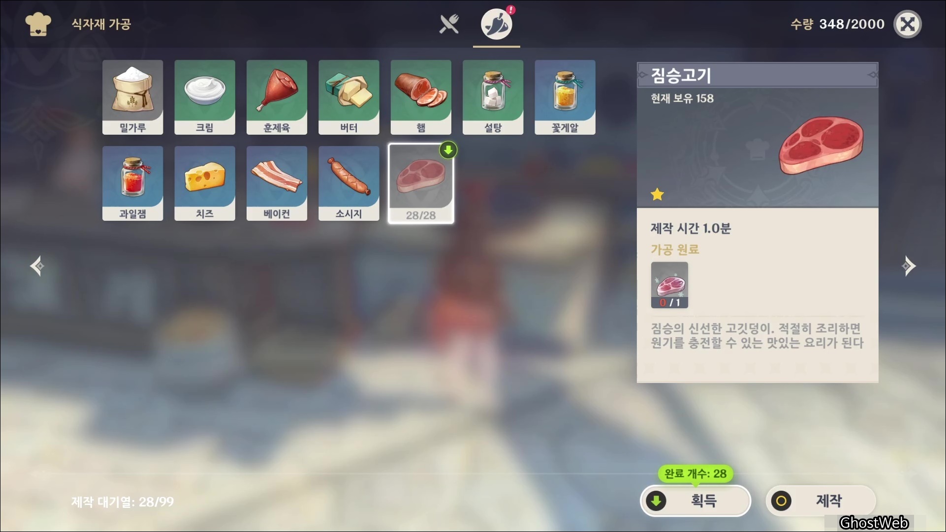이 냉동 생고기를 요리의 식자재 가공 페이지에서 식자재 가공을 통해 짐승고기로 교환할 수 있어요. (제작 시간 1분)