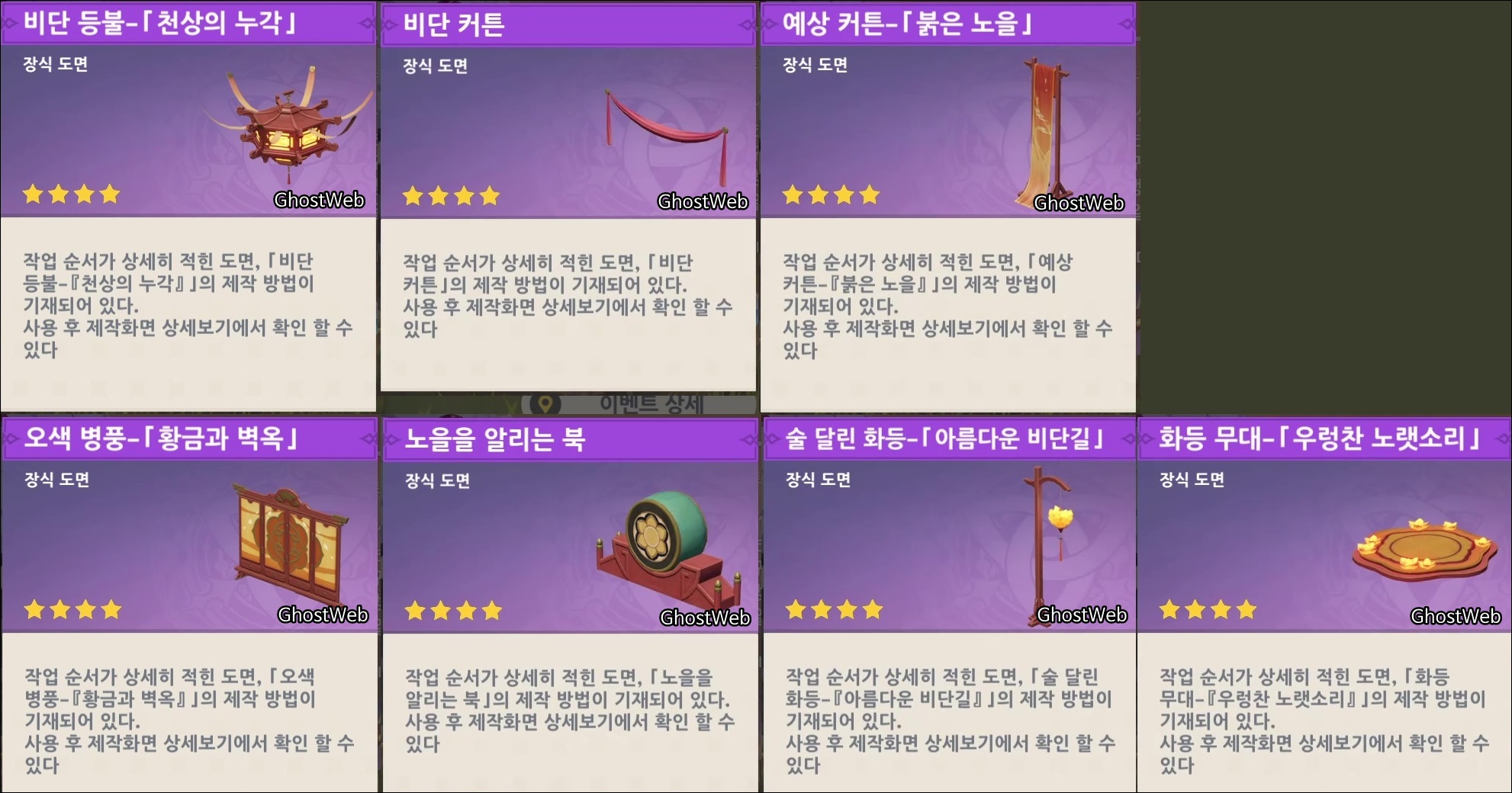 - 비단 등불 (천상의 누각), 비단 커튼, 예상 커튼, 오색 병풍, 노을을 알리는 북, 술 달린 화등, 화등 무대