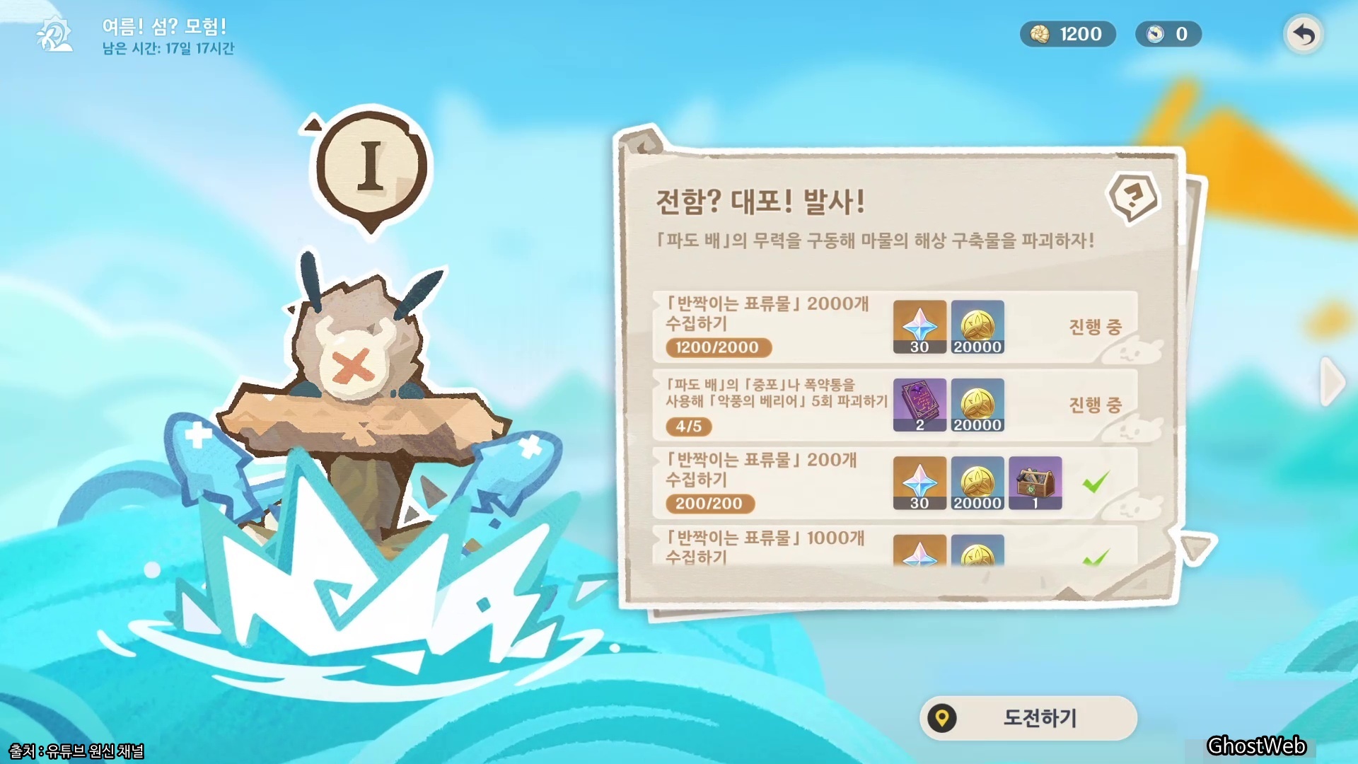 - 파도 배의 중포나 폭약통을 사용해 악품의 배리어 5회 파괴하기