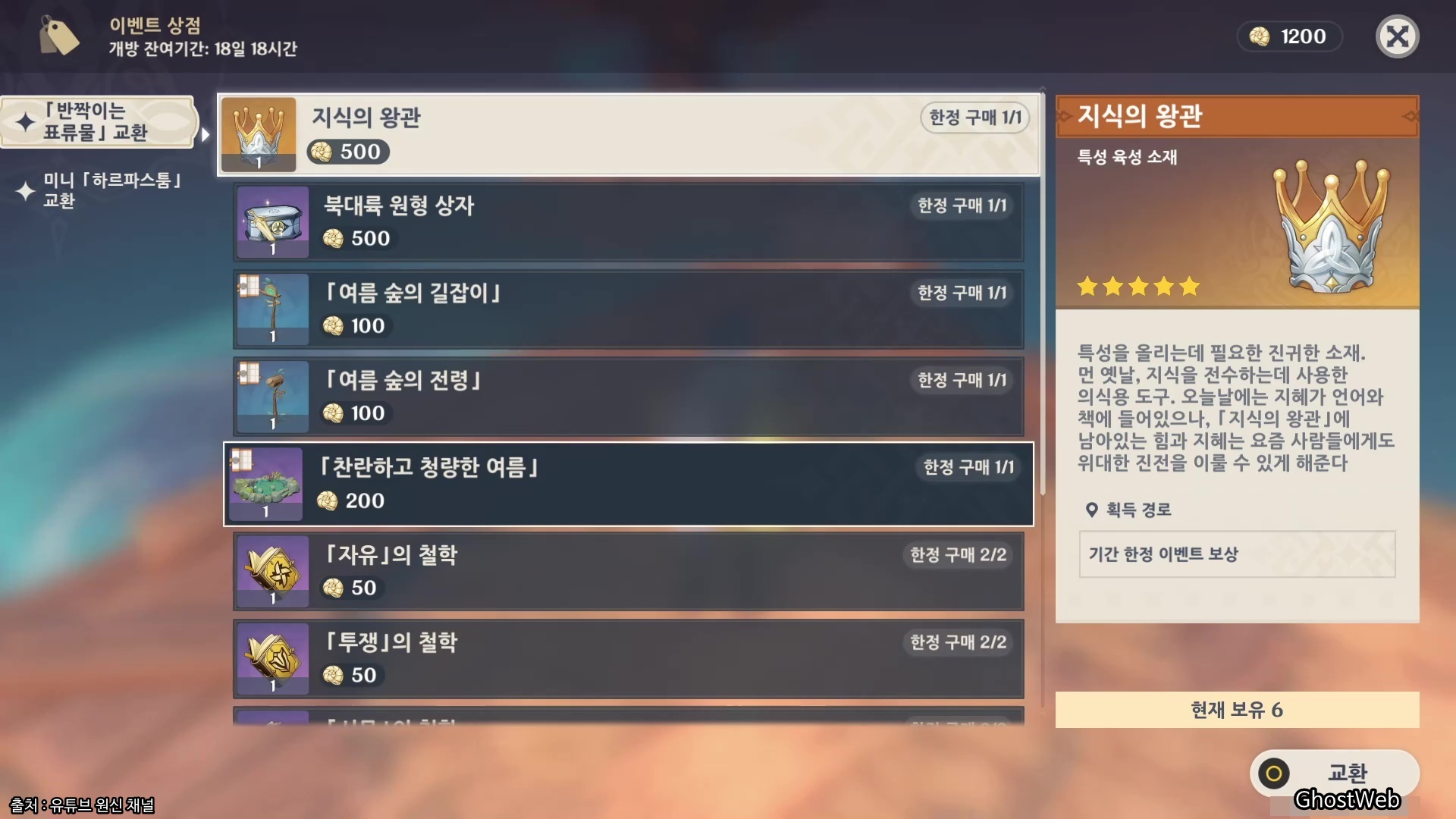 - 지식의 왕관 (500개, 특성 육성 소재)