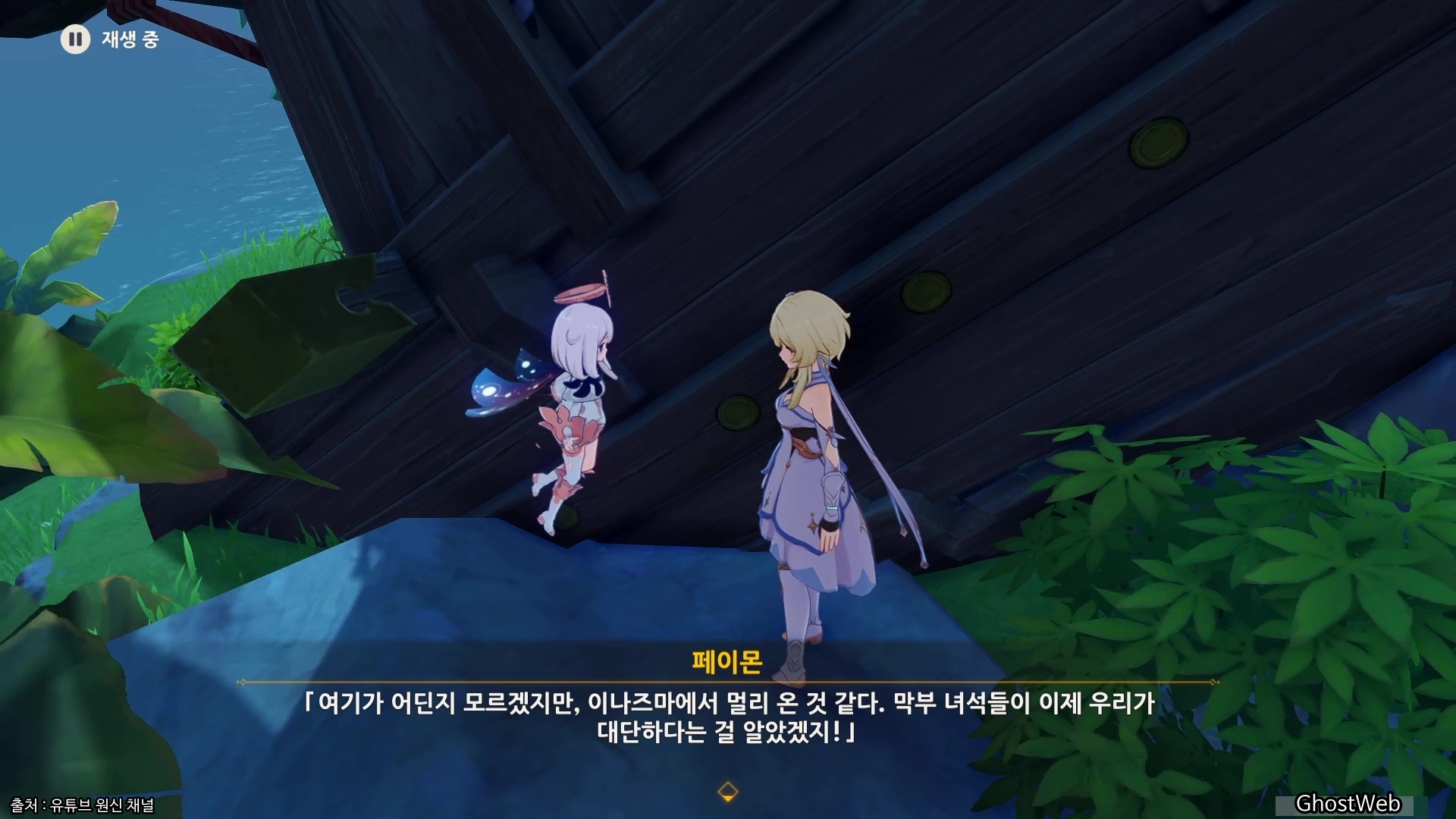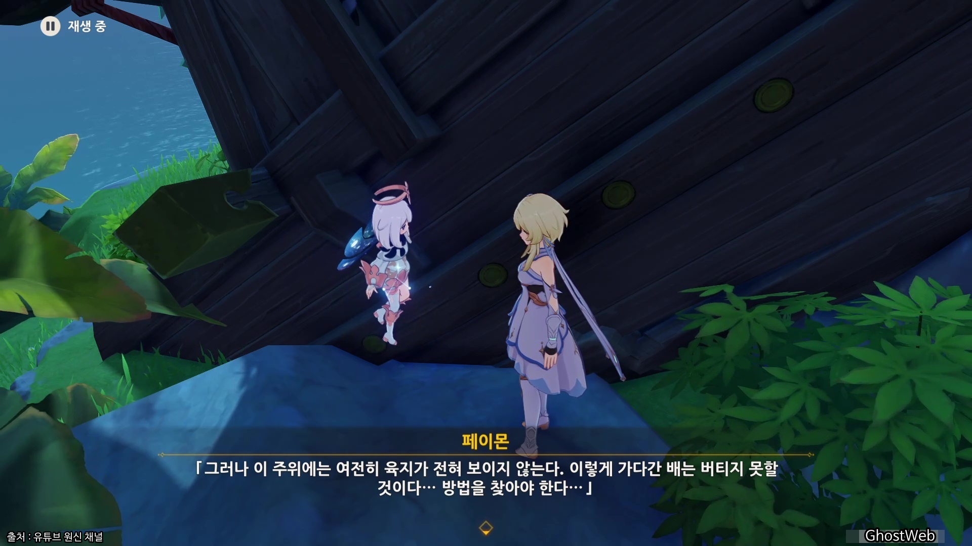 위에서 표시된 섬에 가면 반쯤 부셔진 배를 발견하고 파소된 나무판자를 얻어 그들의 옛 이야기를 알 수 있는데, 이나즈마에서 먼 지역으로 이동하다 사고로 배가 파괴되어 남동쪽 방향으로 표류했다는 것을 알 수 있어요.