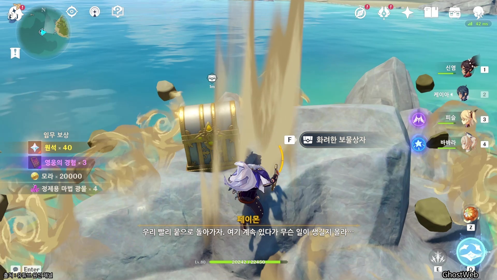 적을 처치하면 원석 40, 영웅의 경험 3, 모라, 정제용 마법 광물이 임무 보상으로 지급되고 바위 위에 <화려한 보물상자>가 나타나 추가로 아이템을 획득할 수 있어요.