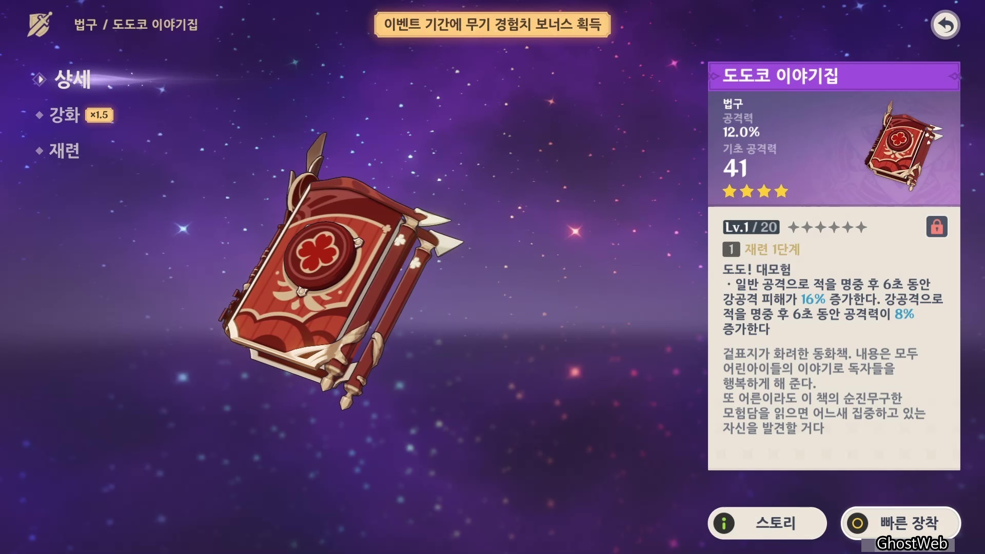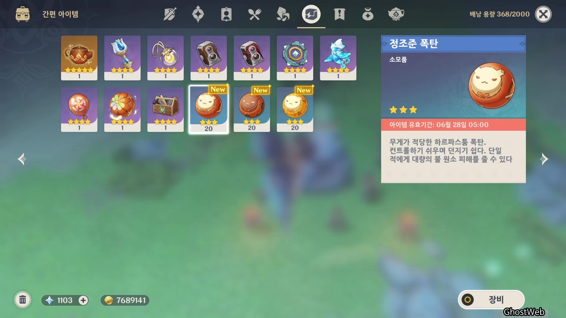- 한 라운드 동안 <둥둥 폭탄>을 사용해 적 3명 처치, 누적 2회 진행하기 : 경험치 책 2, 모라 20000