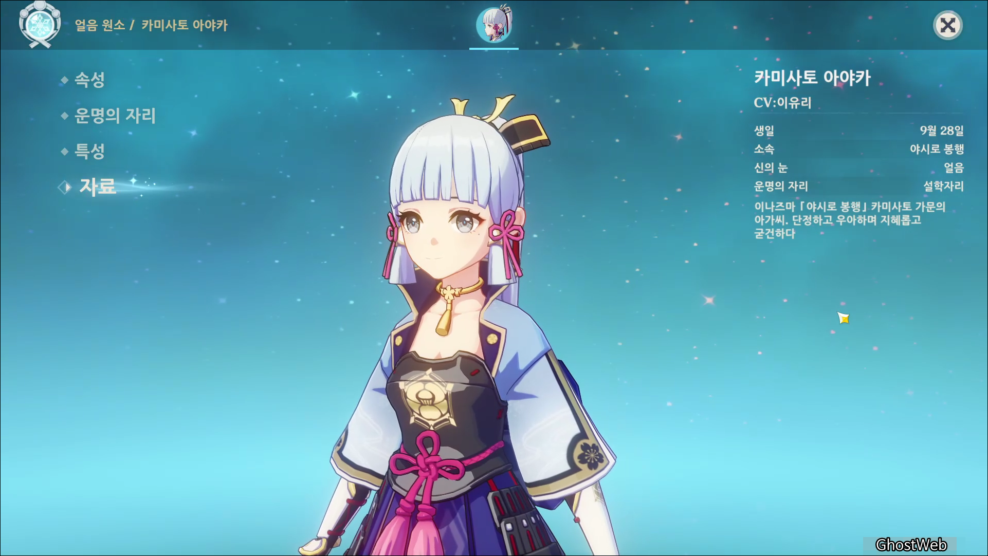 카미사토 아야카는 얼음 원소 캐릭터로 한손검을 주로 사용하는 캐릭터에요.