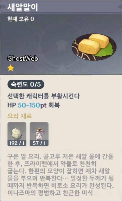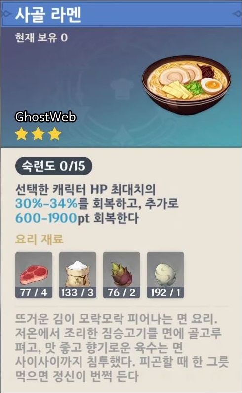 · 시골 라멘 (5000 모라, HP 최대치 30~34% 회복, 추가로 600~1900pt를 회복, 짐승 고기 4, 밀가루 3, 죽순 2, 새알 1)