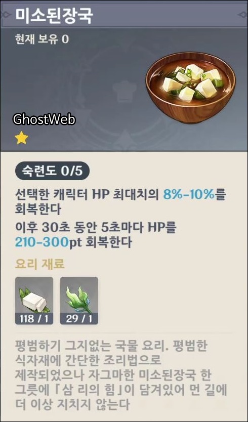 · 미소된장국 (1250 모라, HP 최대치 8~10% 회복, 이후 30초 동안 5초마다 HP를 210~300pt 회복, 두부 1, 해초 1)