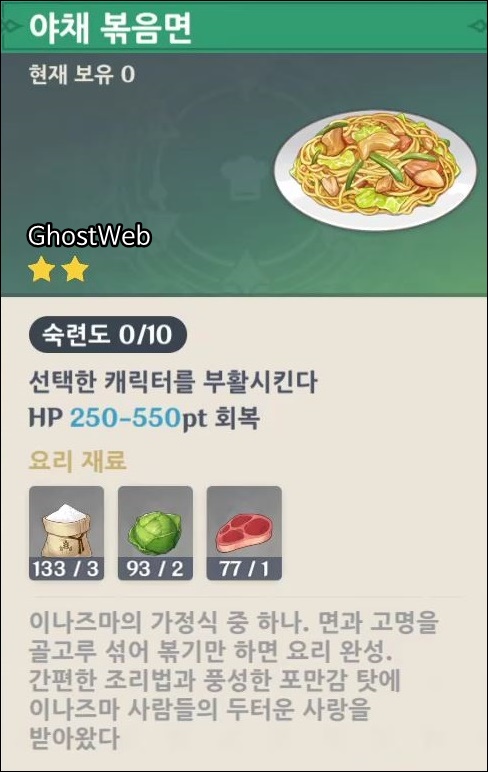 · 야채 볶음면 (2500 모라, 선택한 캐릭터 부활, HP 250~550pt 회복, 밀가루 3, 양배추 2, 짐승 고기 1)