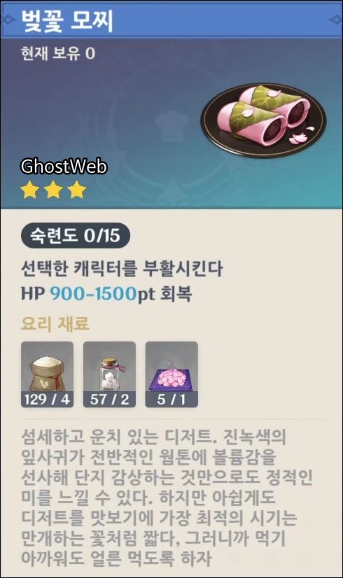 - 벚꽃 모찌 (쌀 4, 설탕 2, 벚꽃 수구 1)