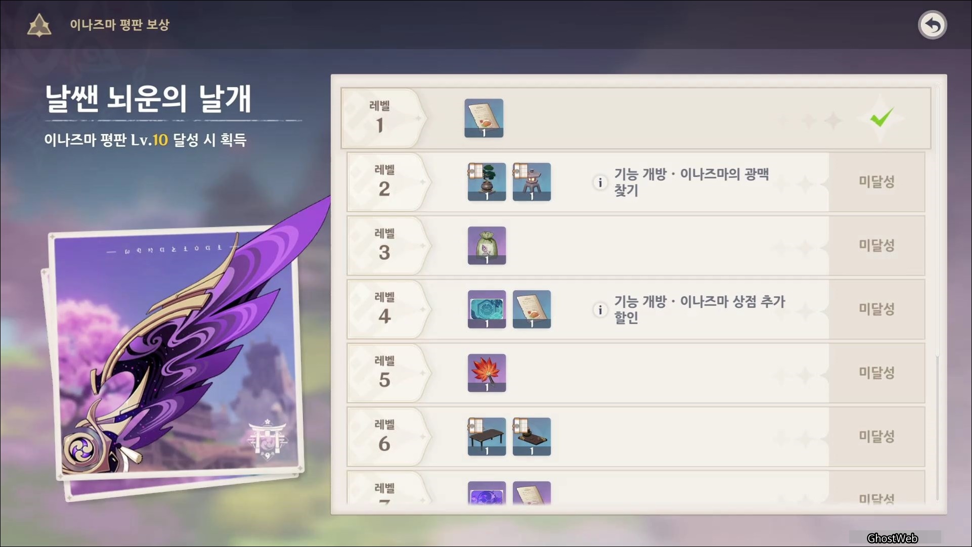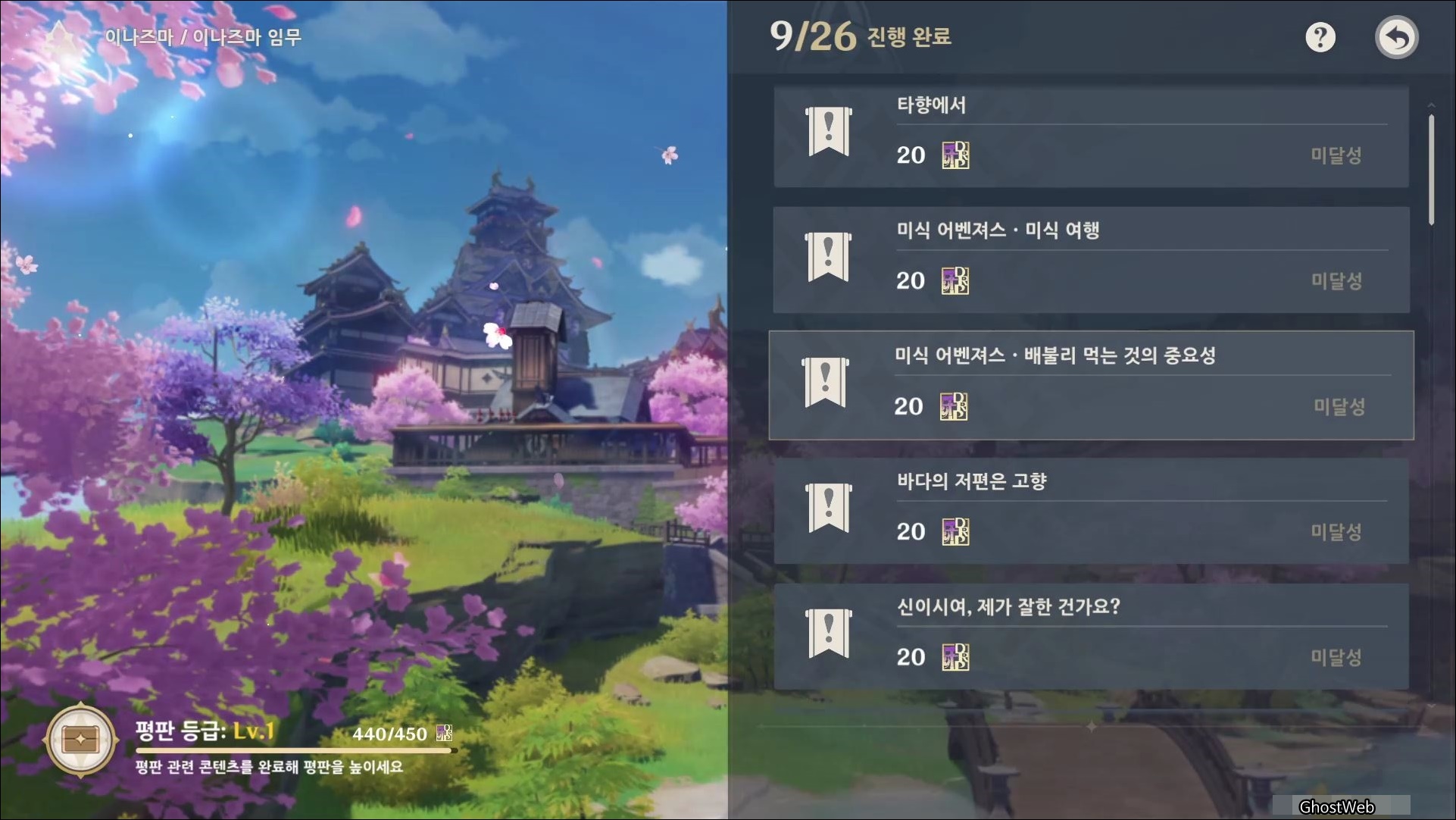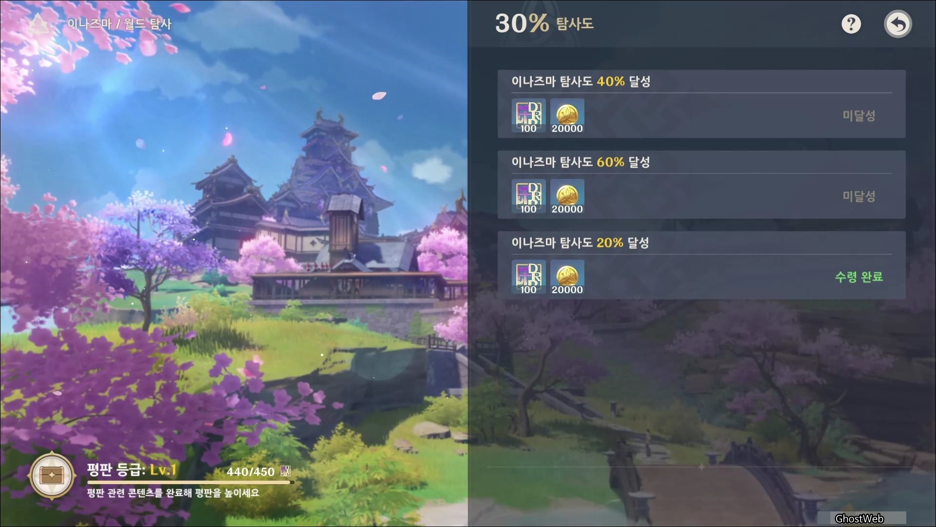 - 이나즈마 탐사도 20%, 40%, 60% 달성 (각 평판 경험치 100, 모라 20000)