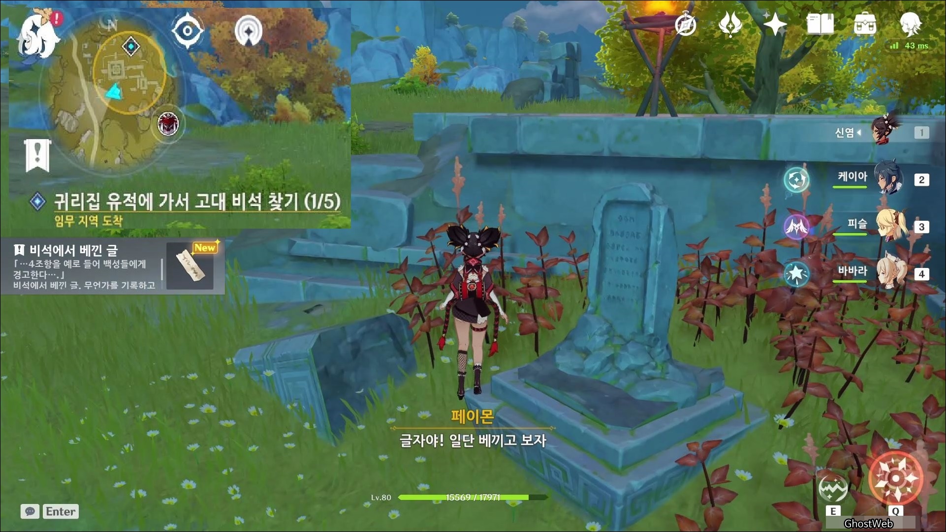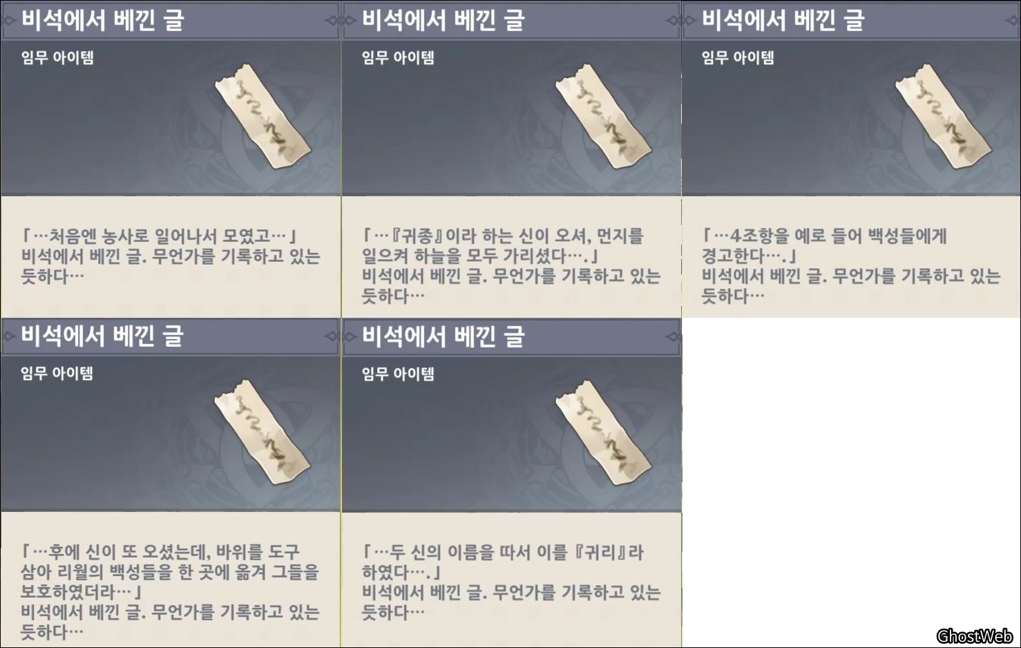 비석 2곳을 찾으면 내용을 확인하고 <망서 객잔>에서 쉬면서 귀종 4훈을 해독한다고 하며 귀리의 보물 1 임무를 완료하며 보상으로 <원석 30개>, <유배자의 머리 장식 1>개를 받을 수 있어요.