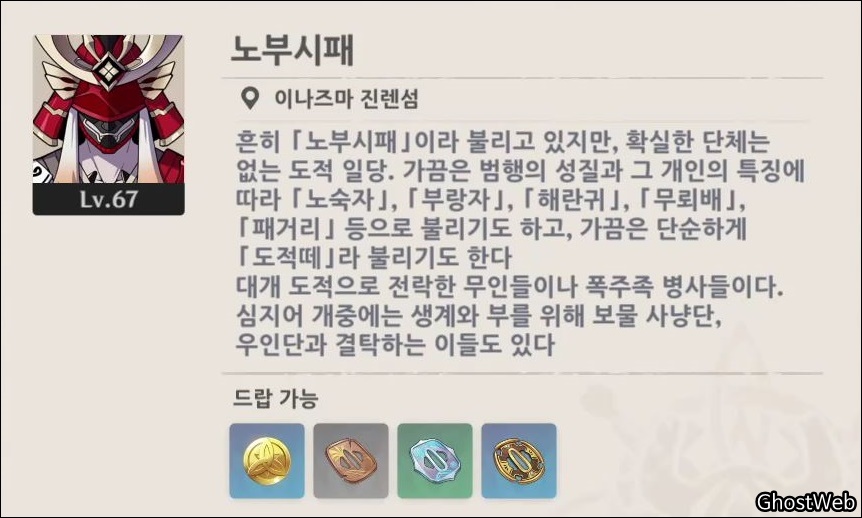 노부시패는 이나즈마 지역에 분포하며 무리를 지어 있는 것을 볼 수 있으며, 보물 사냥단과 함께 있기도 해요.