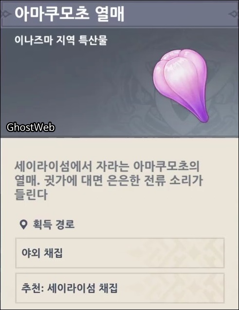 아마쿠모초 열매는 이나즈마 성 아래 지역에 있는 <세이라이섬>을 탐험하다 보면 발견할 수 있으며, 라이덴 쇼군의 캐릭터 육성 소재이기도 해요.