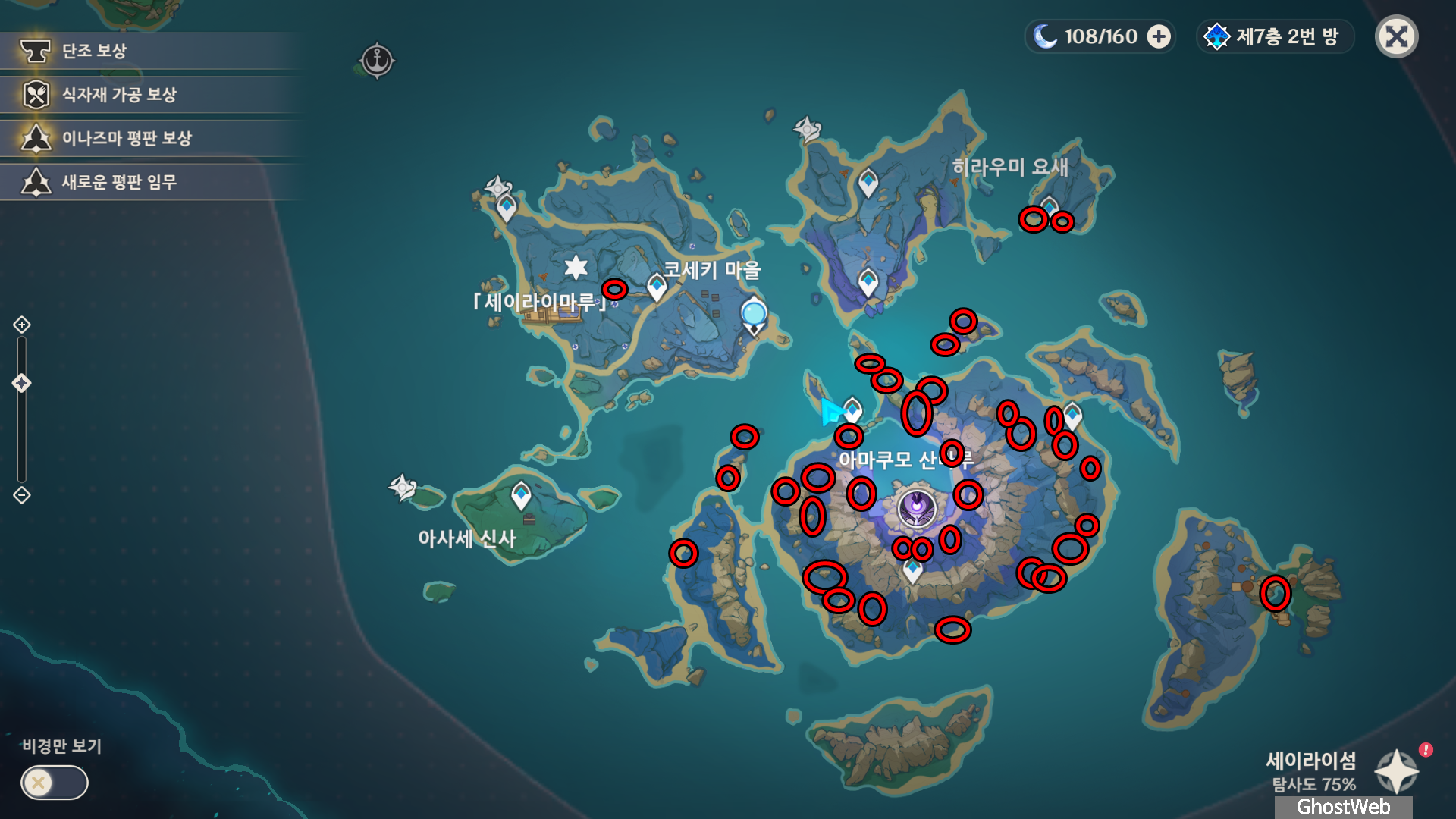 세이라이섬 아마쿠모 산마루 근처에 많이 분포해 있어서 한 바퀴 돌면 그나마 금방 모을 수 있을 거 같네요.