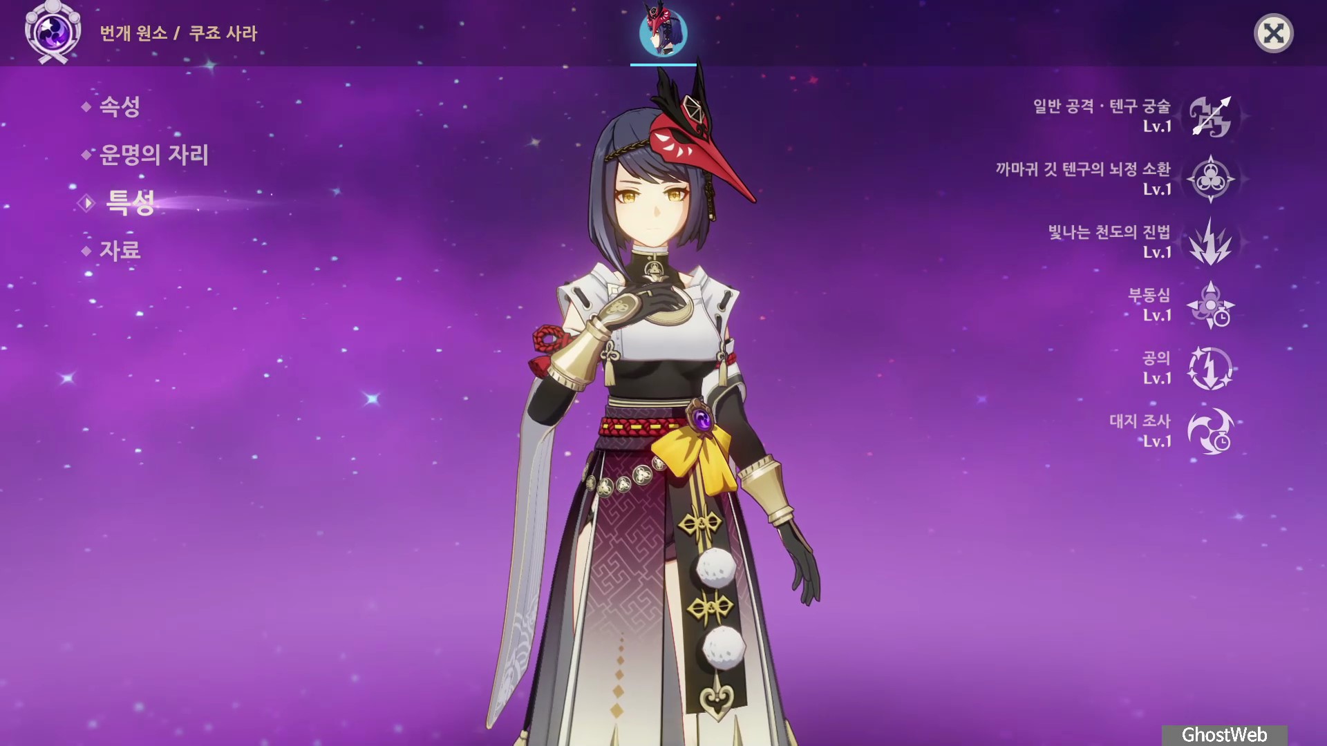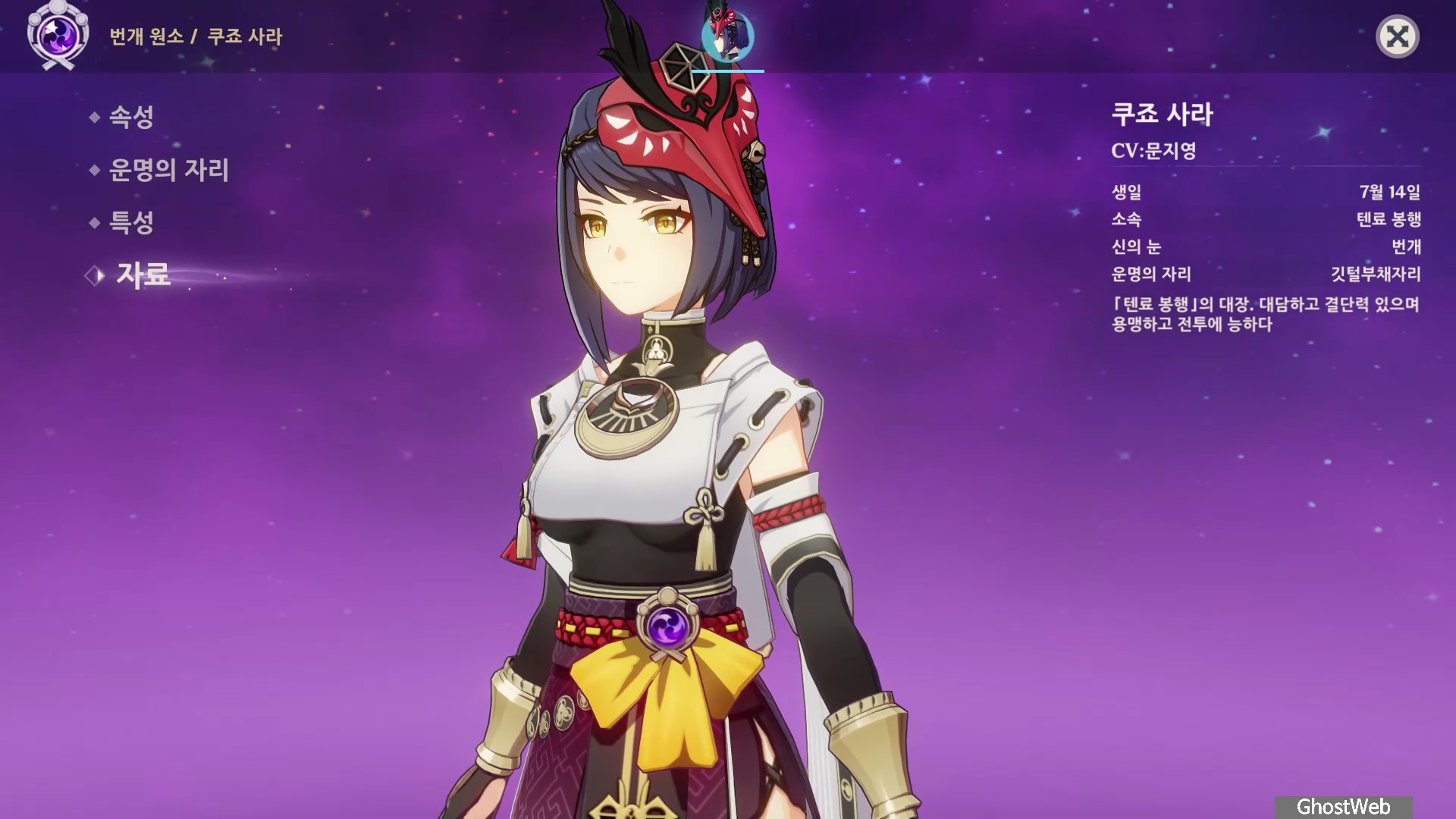 이번에는 이나즈마의 번개 원소 캐릭터인 쿠조 사라에 대해서 정리해보도록 할게요.