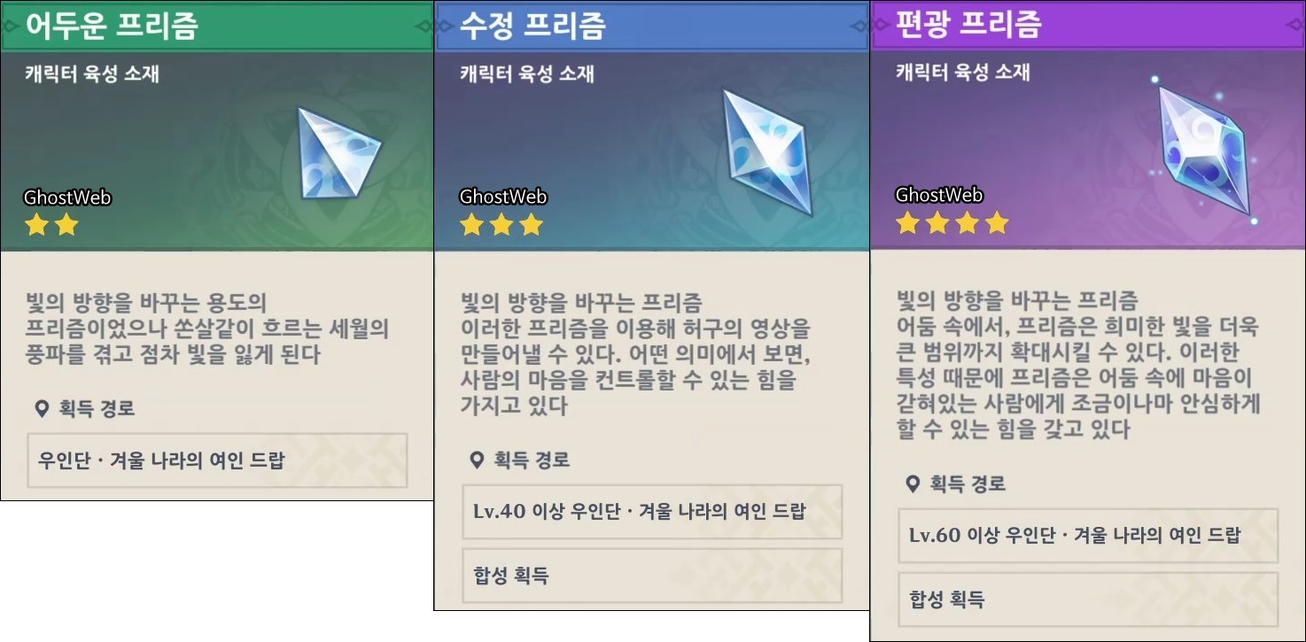 이번에는 캐릭터 육성 소재인 어두운/수정/편광 프리즘을 얻을 수 있는 우인단 <거울의 여인>의 위치를 정리해보도록 할게요.