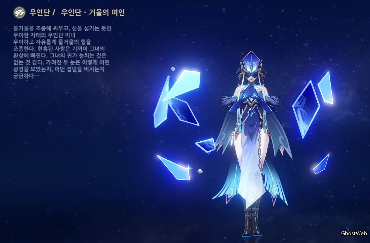 거울의 여인은 물 원소 공격을 하며 대부분 필드에 혼자 돌아다니며, 이나즈마 각 섬에 분포해 있어요.