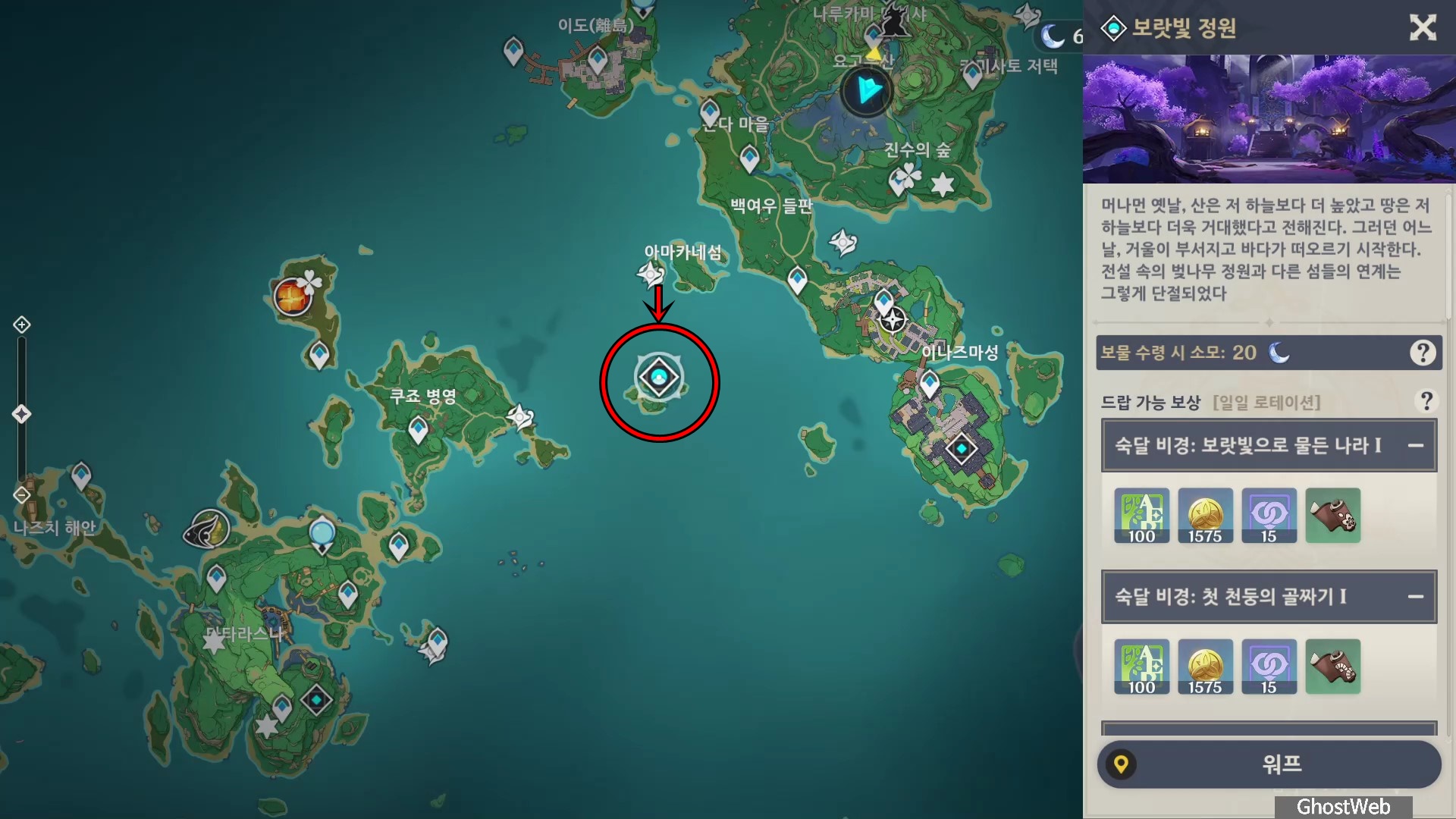 이번에는 이나즈마 캐릭터의 특성 육성 소재를 얻을 수 있는 <보랏빛 정원> 비경을 정리 해보도록 할게요.