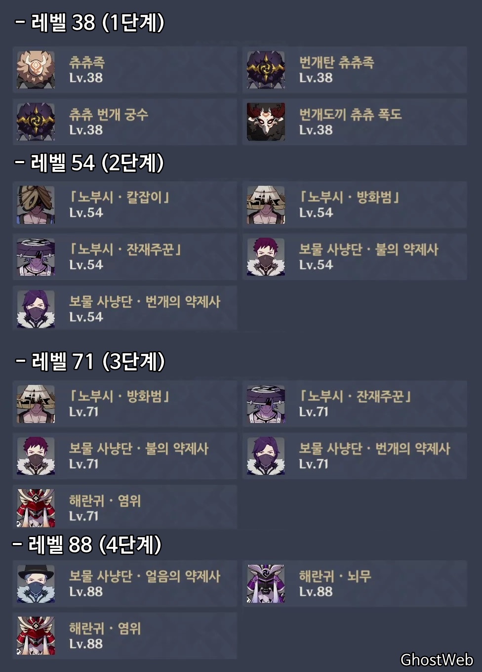 - 레벨 71 (3단계) : 노부시 방화범/잔재주꾼, 보물 사냥단 불/번개의 약제사, 해란귀 염위