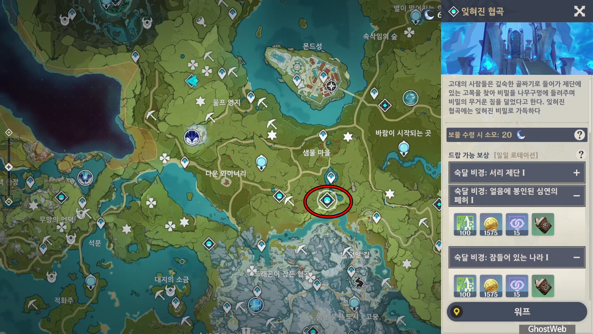 이번에는 몬드 지역 캐릭터의 특성 육성 소재를 얻을 수 있는 <잊혀진 협곡> 비경을 정리 해보도록 할게요.