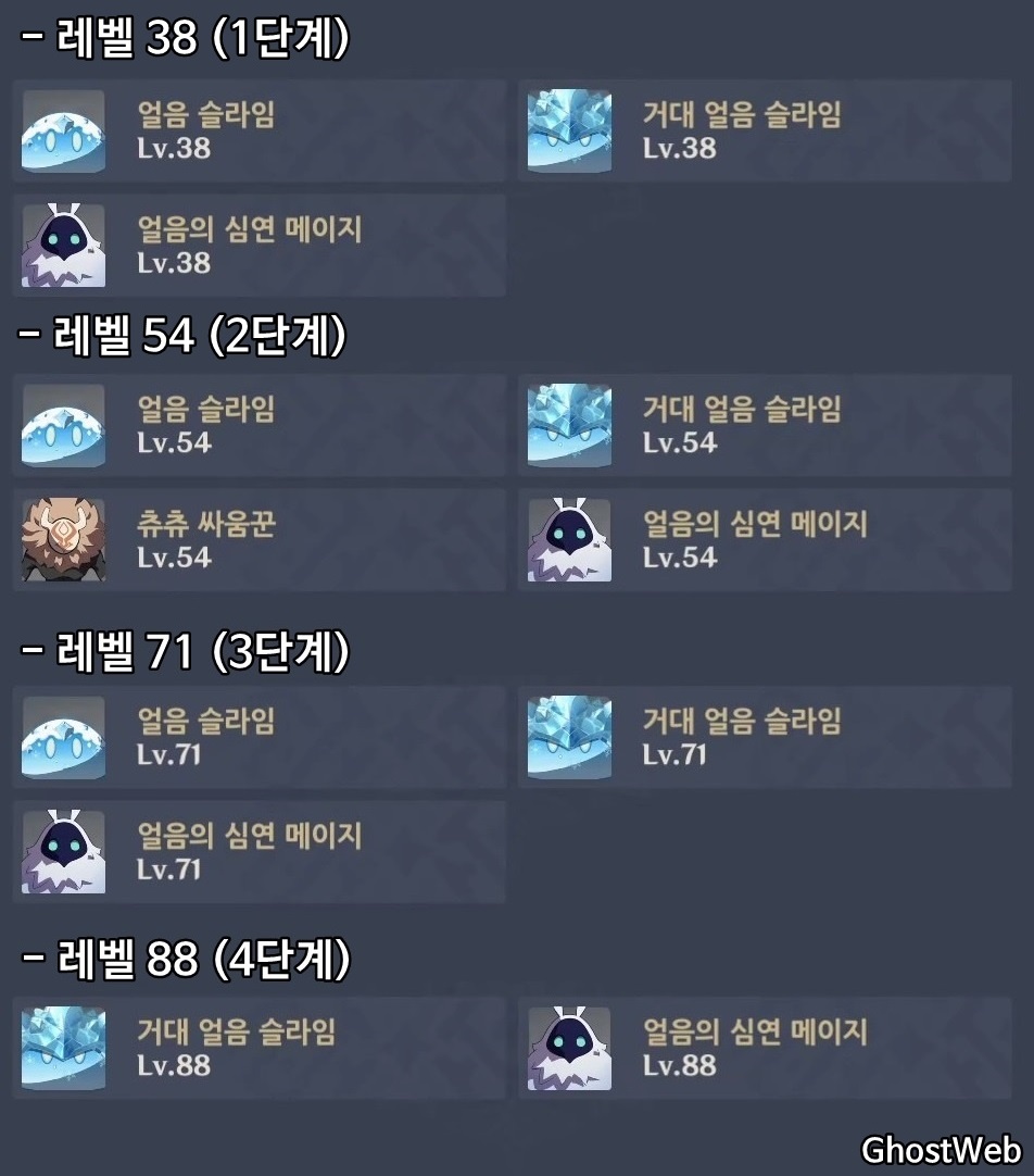 - 레벨 54 (2단계) : 얼음 슬라임, 거대 얼음 슬라임, 츄츄 싸움꾼, 얼음의 심연 메이지