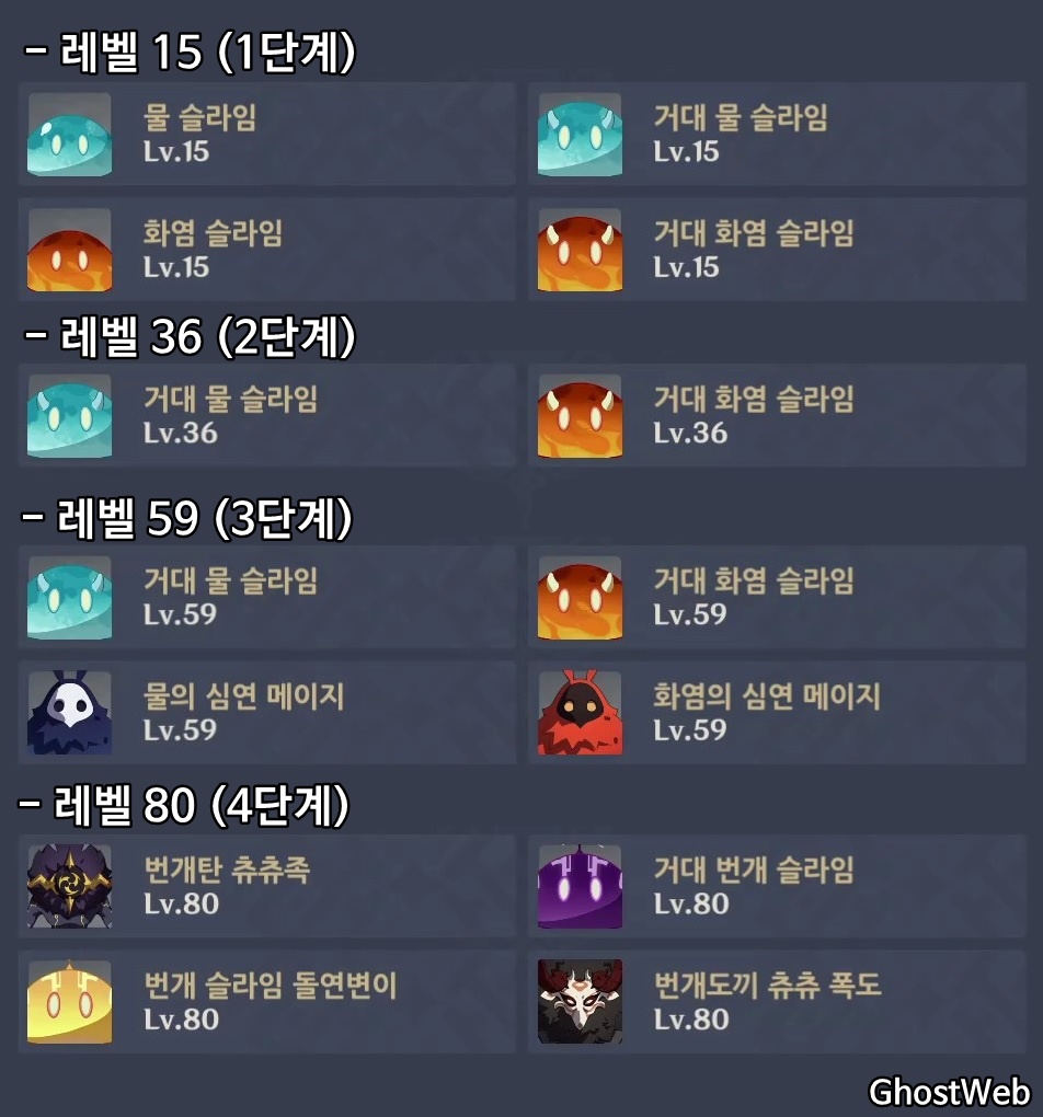 - 레벨 15 (1단계) : 물 슬라임, 거대 물 슬라임, 화염 슬라임, 거대 화염 슬라임