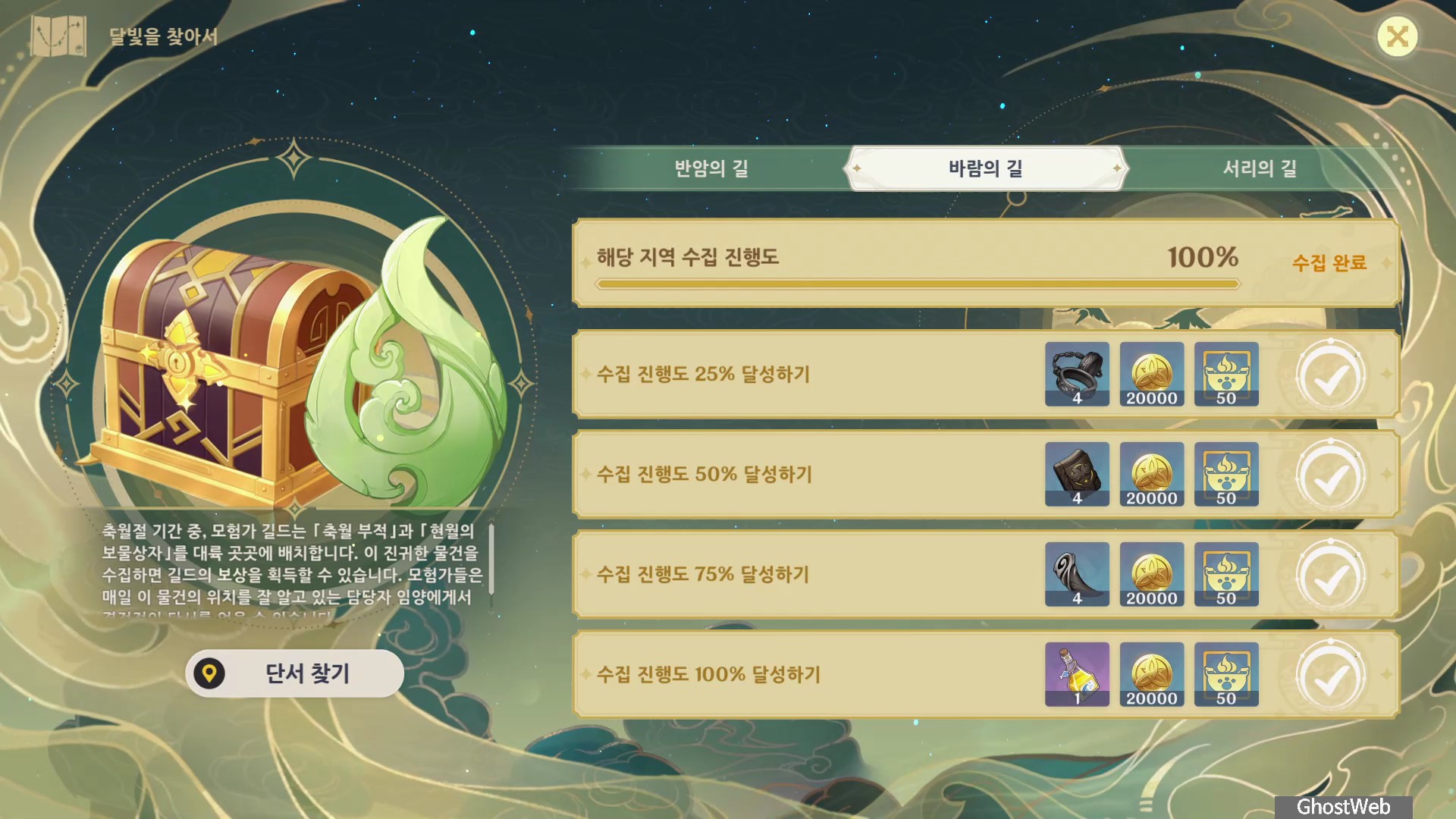몬드의 별이 떨어지는 호수를 중심으로 축월 부적, 현월의 보물상자를 수집하여 일정 수집 진행도를 달성하면 돌파 소재, 모라 등을 얻을 수 있어요.