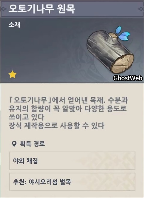 오토기나무는 이나즈마섬 여러 곳에 주로 있어서 금방 모으기 쉬운 원목 중에 하나에요.