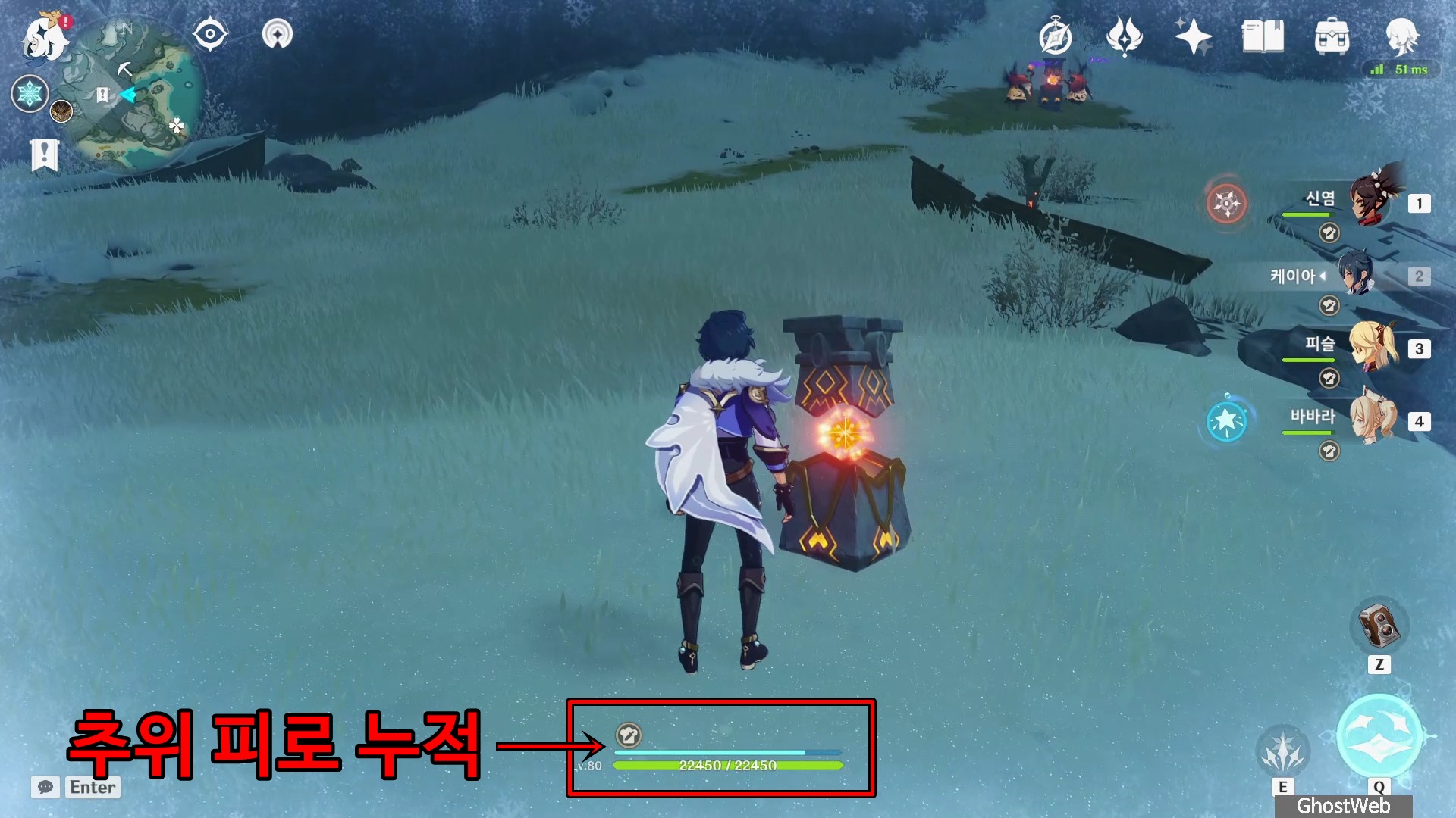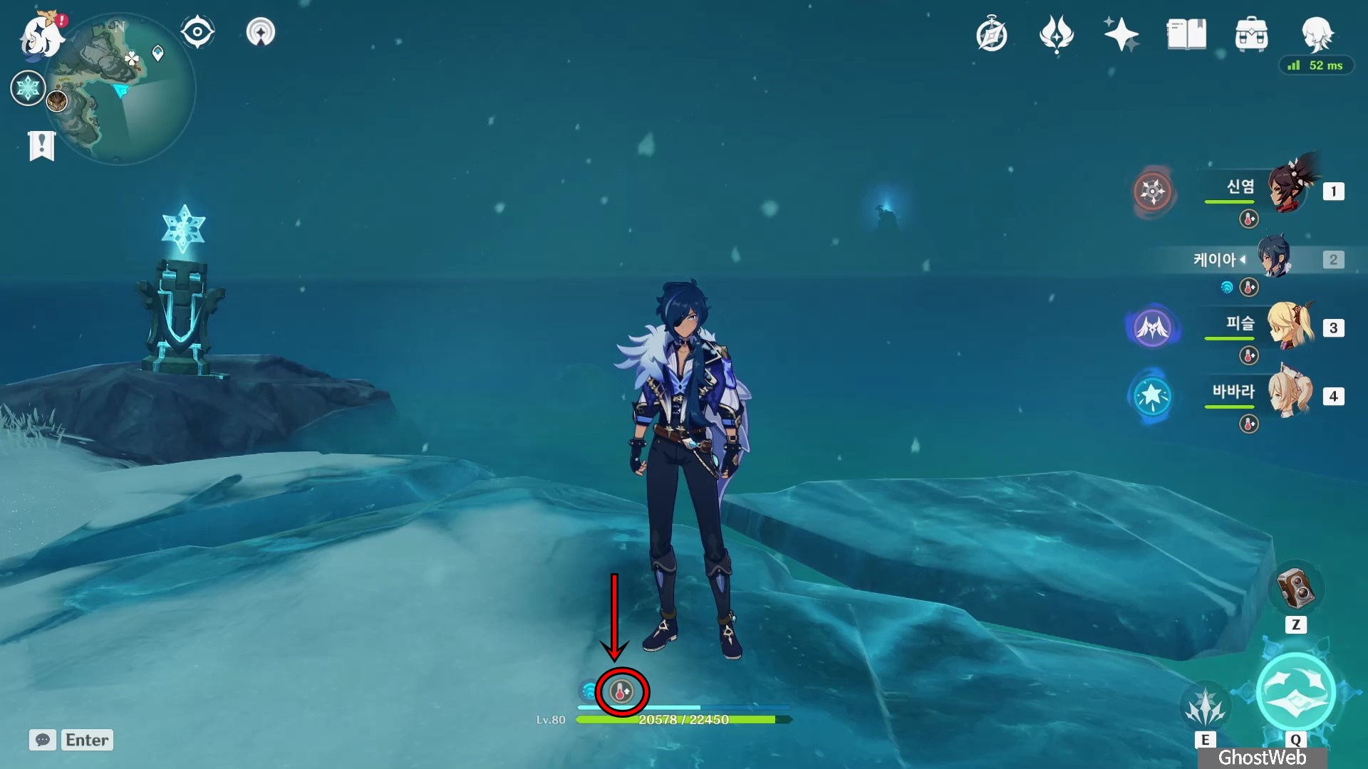 ※ 드래곤 스파인(설산) 지역에서 수영이나 바바라 원소 스킬(힐) 같이 캐릭터에 물 원소가 묻었을 경우 추위 피로 게이지가 더 빠르게 차니 이점 주의하세요.