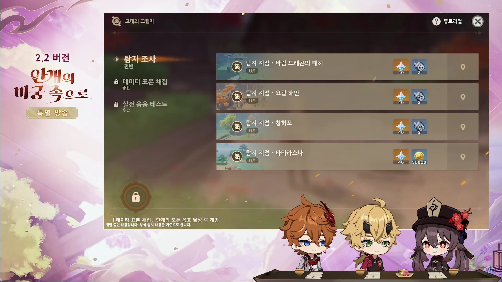 - 보상 : 원석, 모라, 캐릭터 경험 소재, 신염