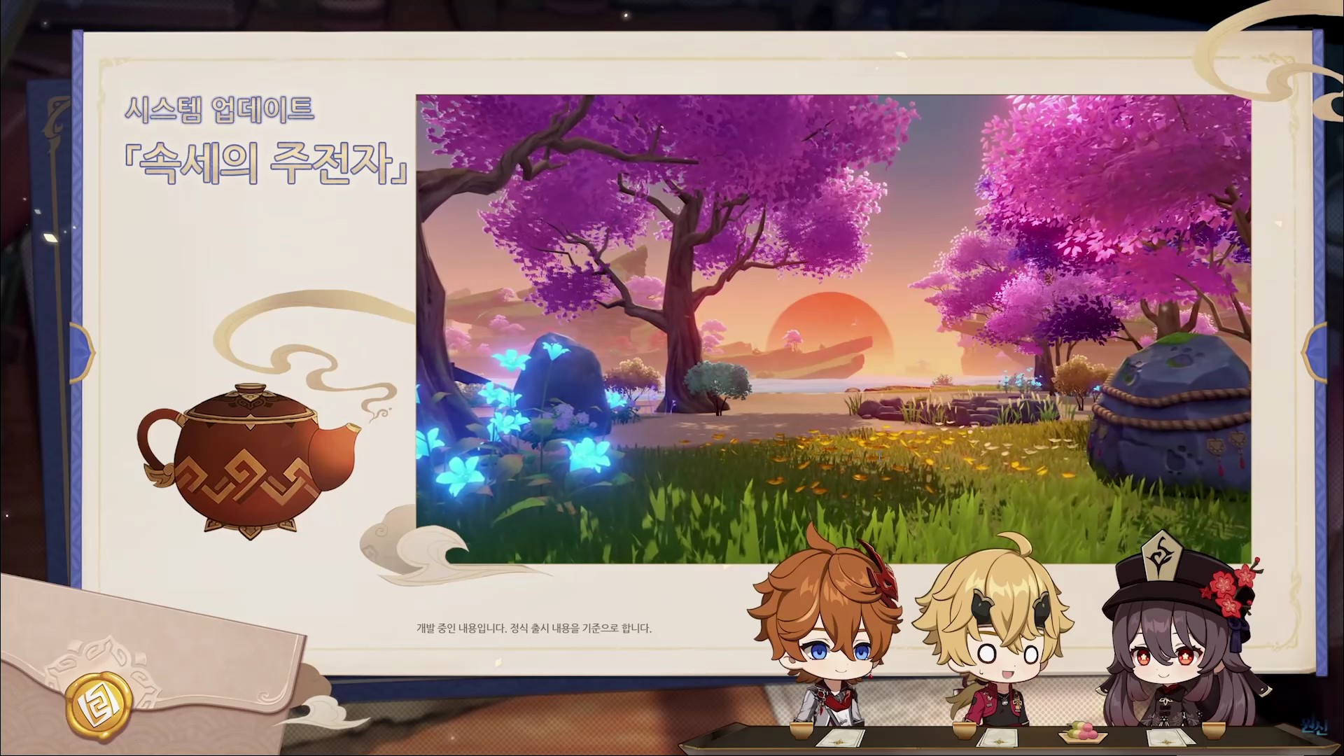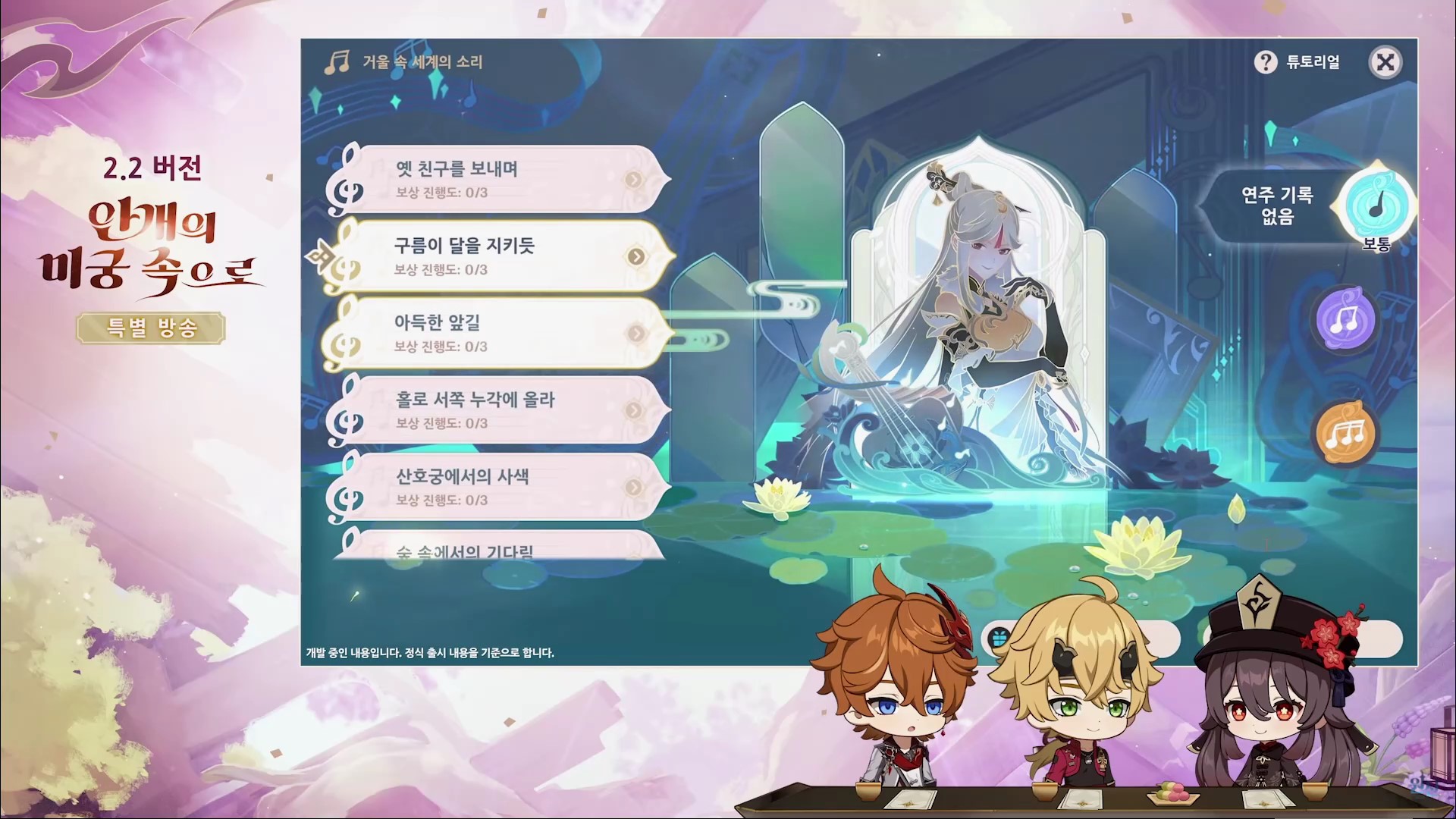 - 다른 캐릭터와 합주 가능 (7개 음악, 종려/응광/각청/소/아야카/라이덴 쇼군/코코미, 난이도 : 보통/어려움/마스터)