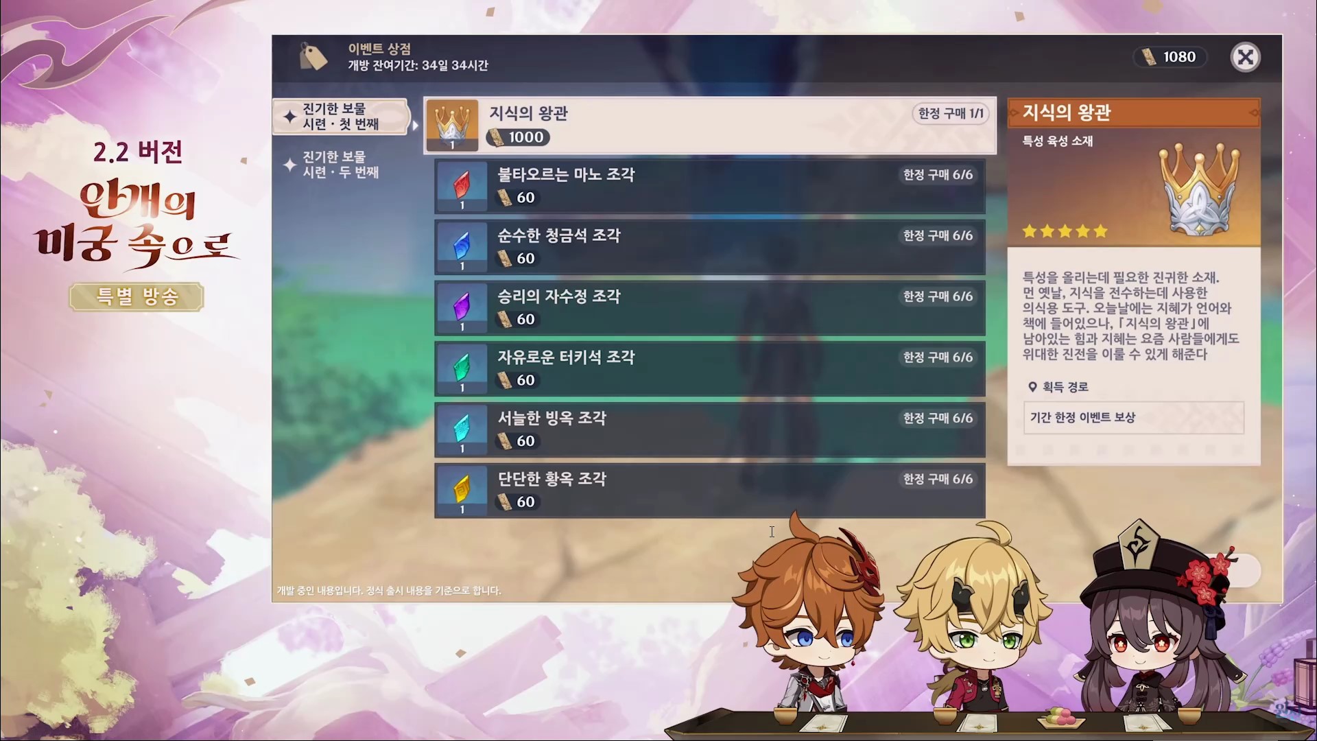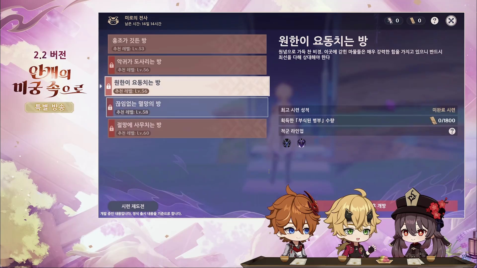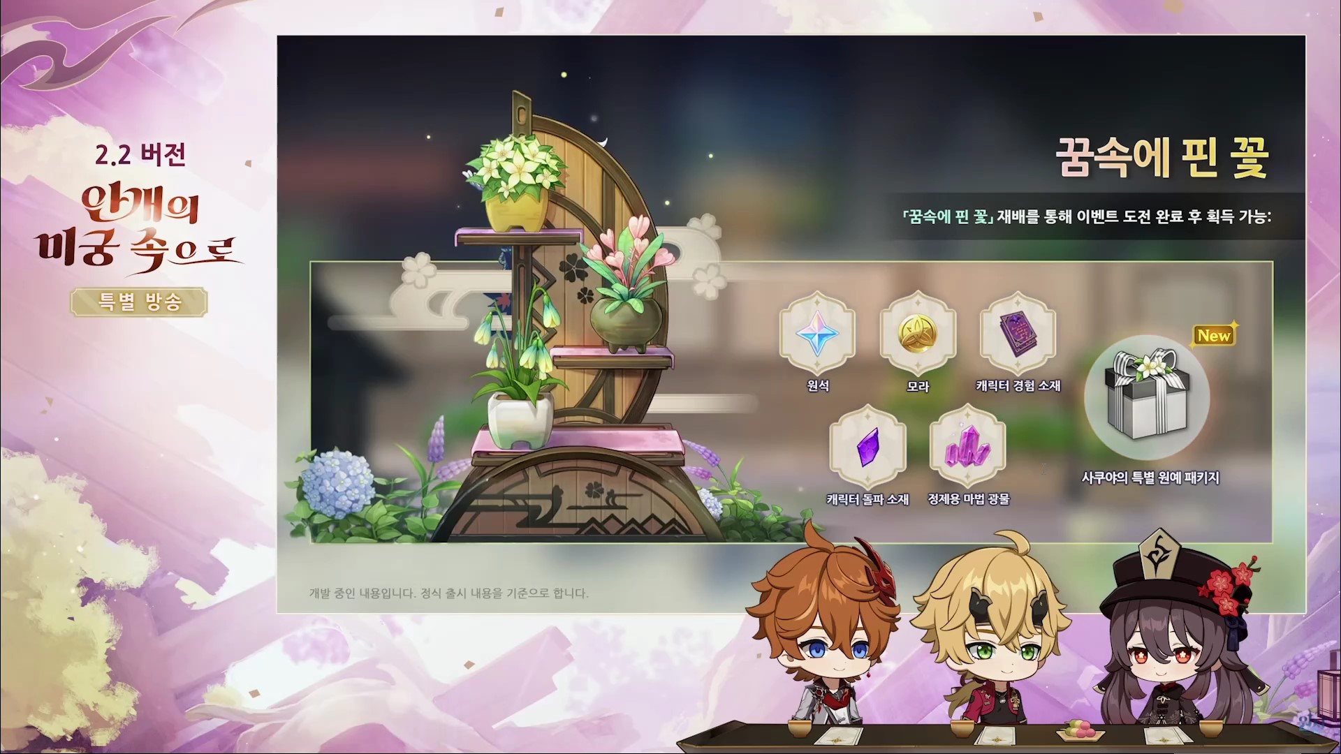- 보상 : 원석, 사쿠야의 특별 원예 패키지(화분대), 모라, 캐릭터 경험 소재, 캐릭터 돌파 소재, 정제용 마법 광물