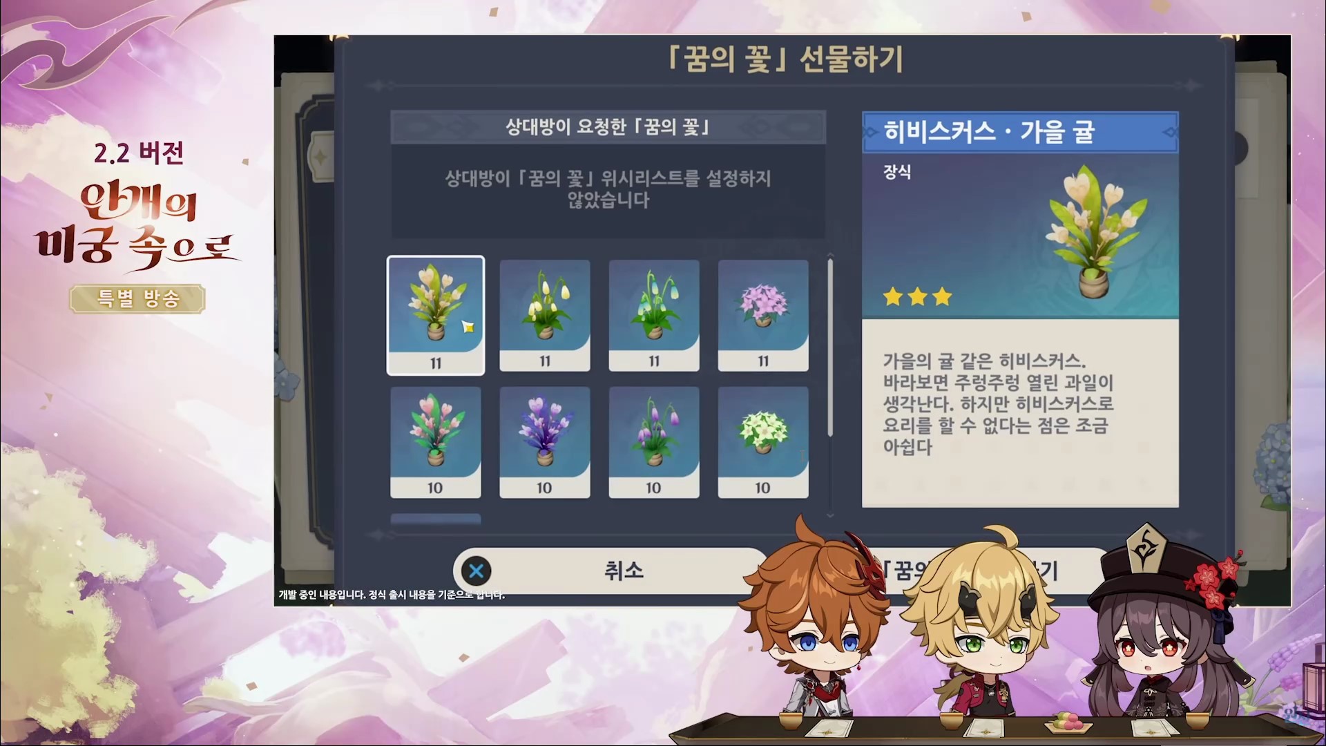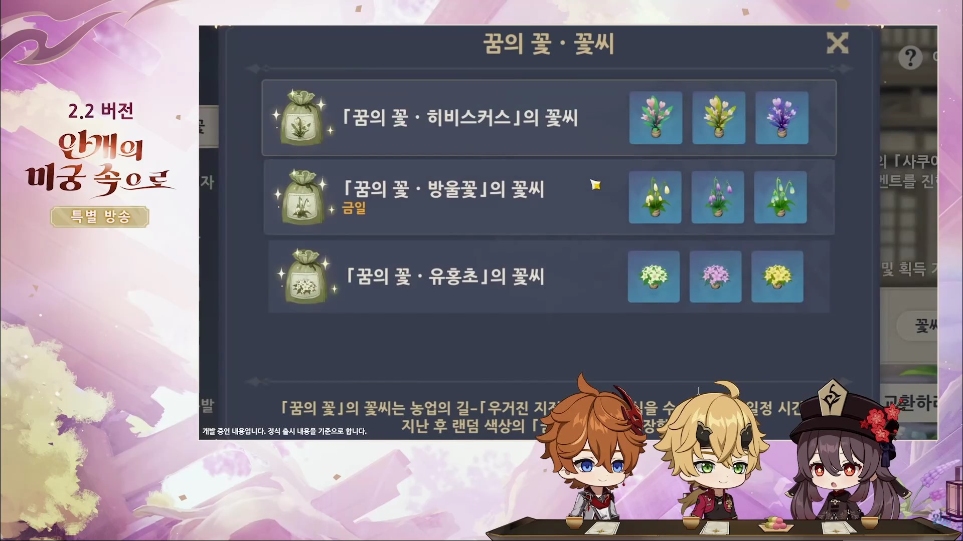 - 수령가능한 꿈의 꽃 씨 : 히비스커스, 방울꽃, 유흥초 (꽃의 색을 다르게 획득 가능)