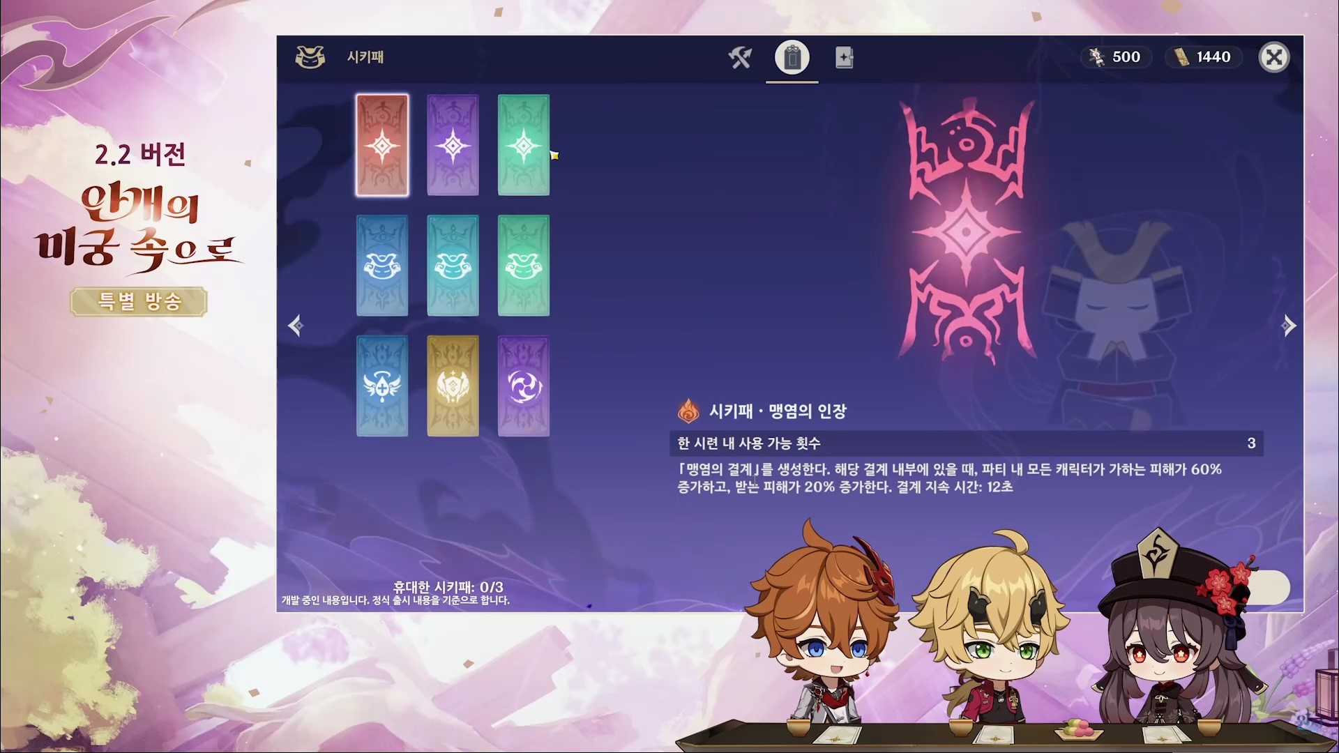 - 출전, 지원 파티를 구성하고 부적술의 힘이 서포트하고 시키패(불, 얼음, 공격력 증가) 3개를 소지하여 비경 도전