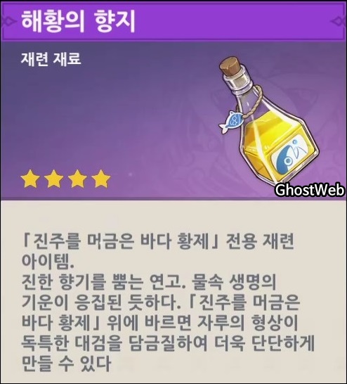 수집 진행도 100%를 달성하면 진주를 문 해황의 재련 재료인 <해황의 향지>를 얻을 수 있어요.