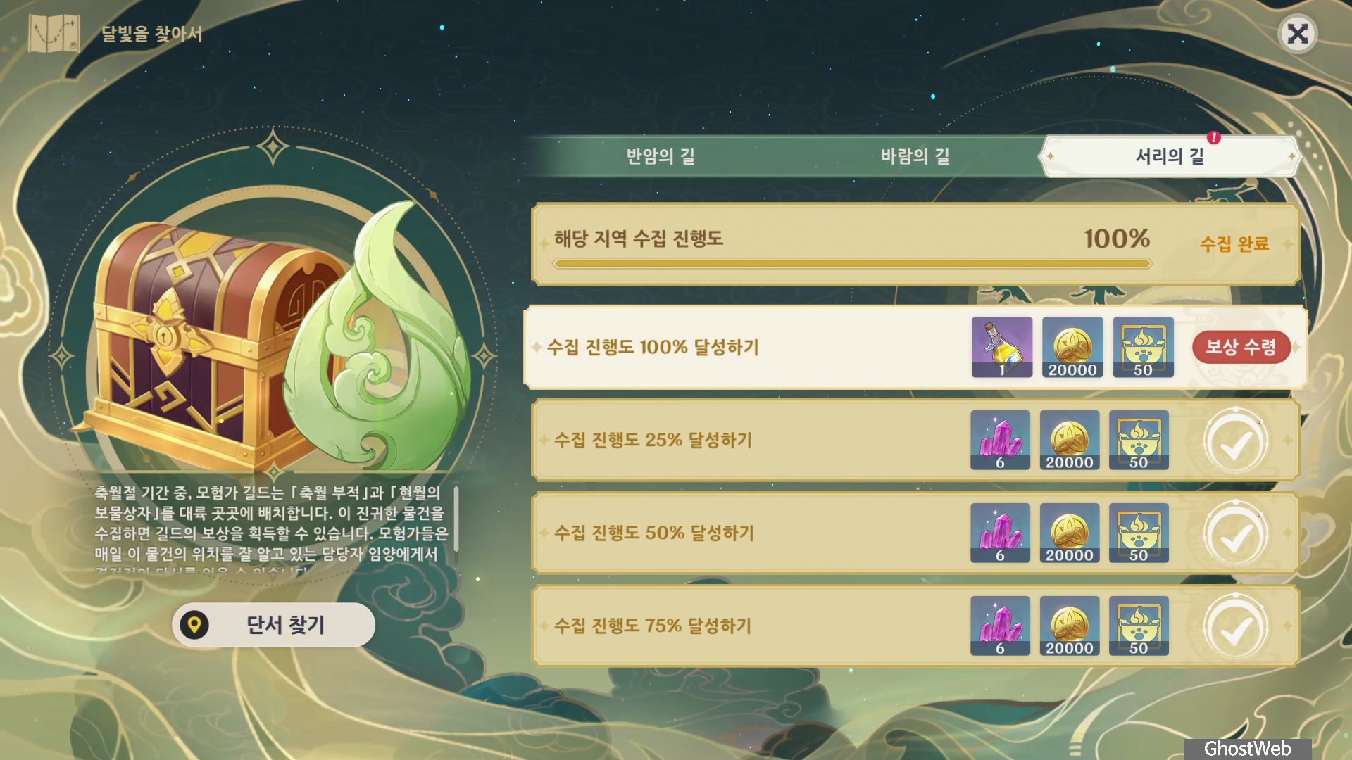 수집 진행도 확인과 보상 수령은 달빛 속 광경 이벤트 창에서 달빛의 찾아서 페이지에서 할 수 있어요.