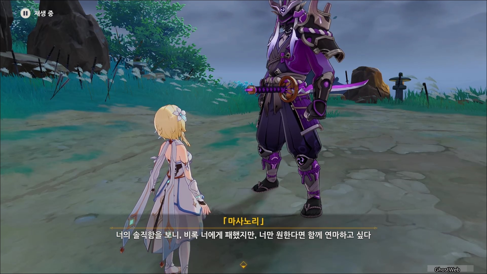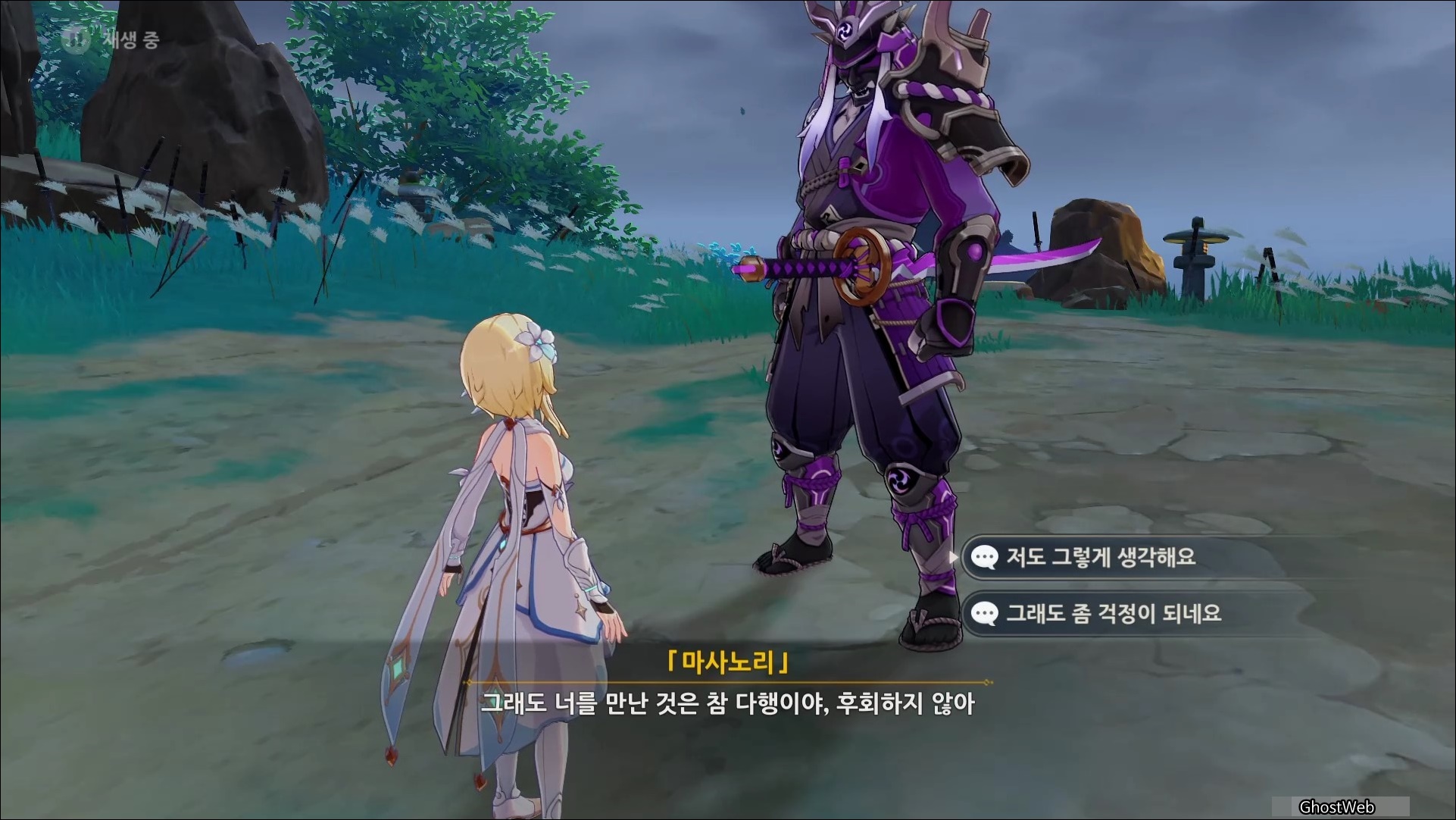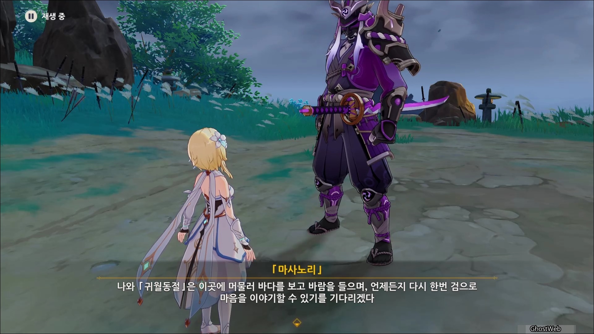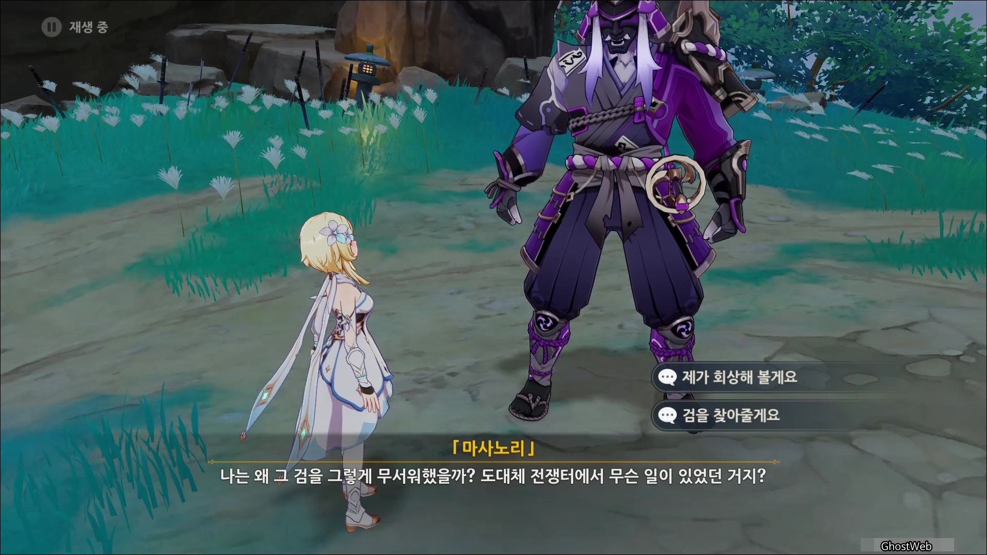 마사노리를 처치하고 다시 대화를 나누면 전쟁터에서 무서워 했던 검이 생각단다고 하며 여행자에게 그 검을 찾아달라고 부탁을 해요.