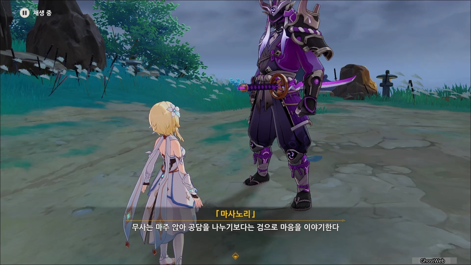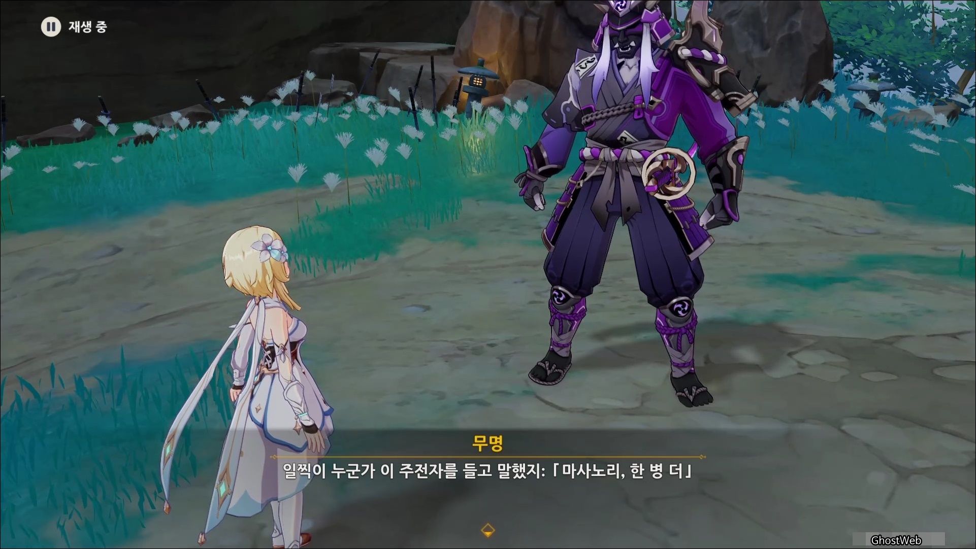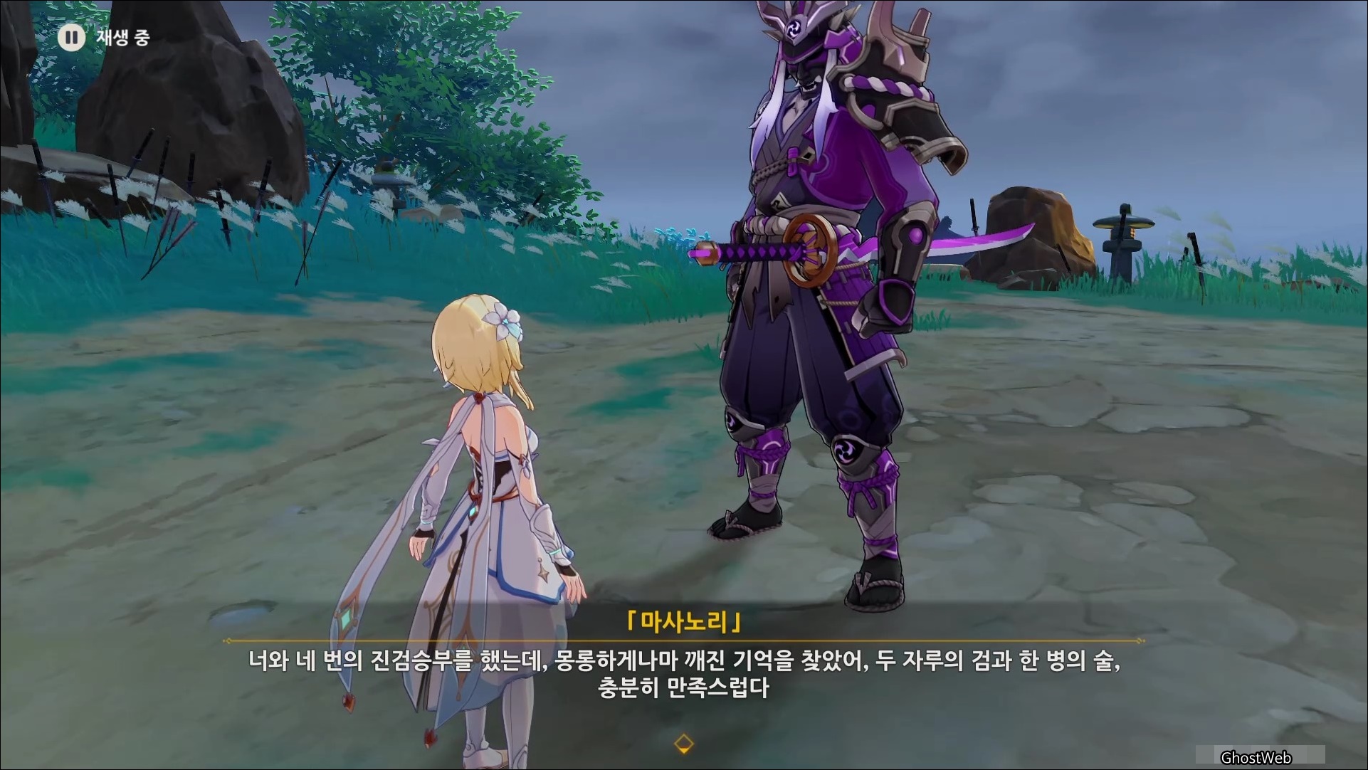 술을 마신 무명의 무사는 술이 쓰다고 하며 본인의 이름이 마사노리 였다는 것을 떠올리며, 다시 기억을 떠올리기 위해 여행자와 대결을 신청해요. (그만해...)