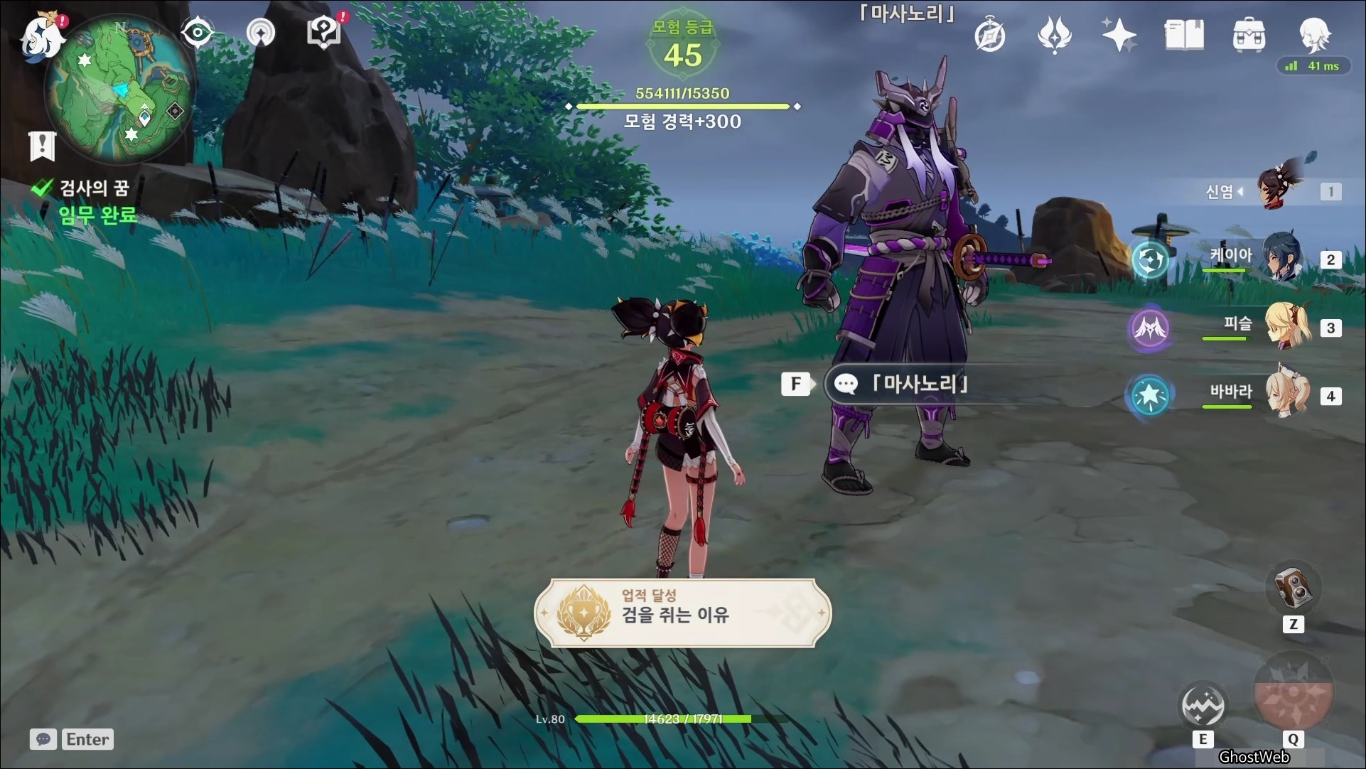 마사노리를 처치하면 통제력을 잃었다고 하며, 이전 기억 좋은 기억이 아닌거 같다며 생각을 그만하고 패배를 인정하면서 임무가 완료되며 보상 수령과 <검을 쥐는 이유 업적>을 달성할 수 있어요.