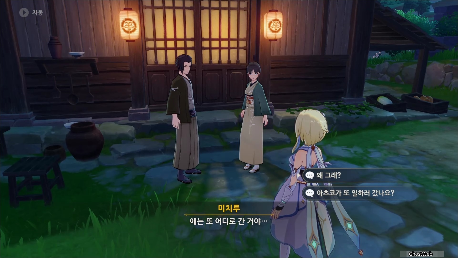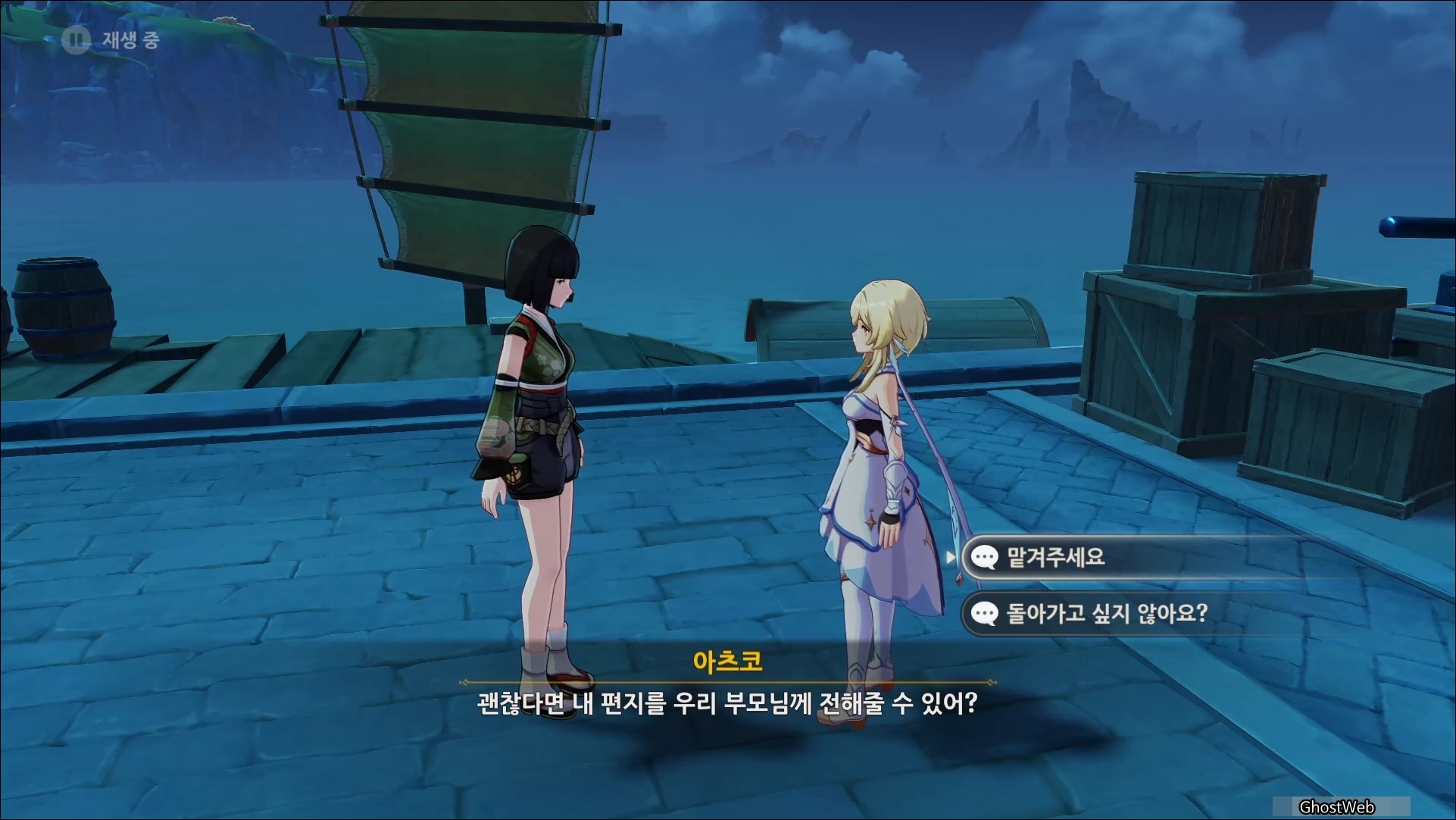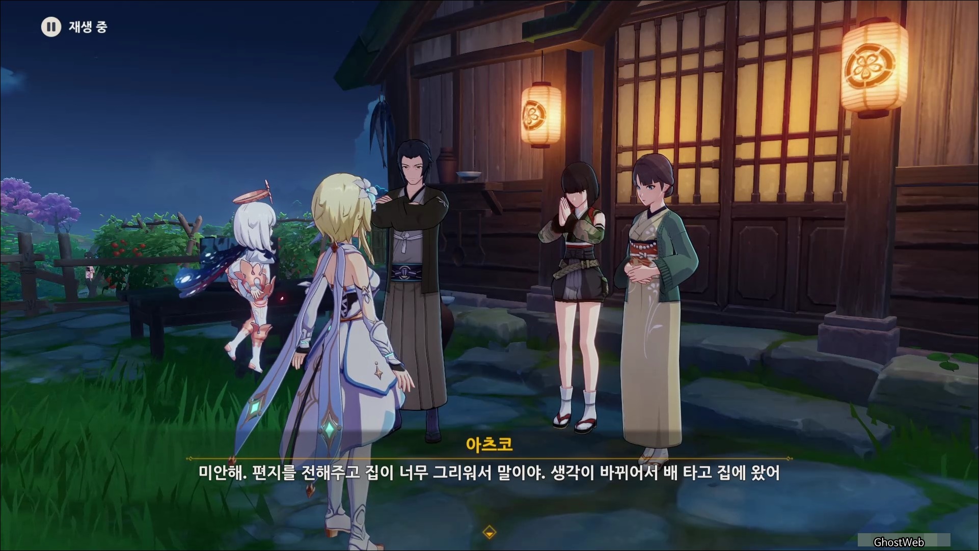 리월항구에 있는 아츠코에게 말을 걸면 이나즈마에 있는 부모님에게 편지를 배달해달라고 여행자에게 부탁을 해요.