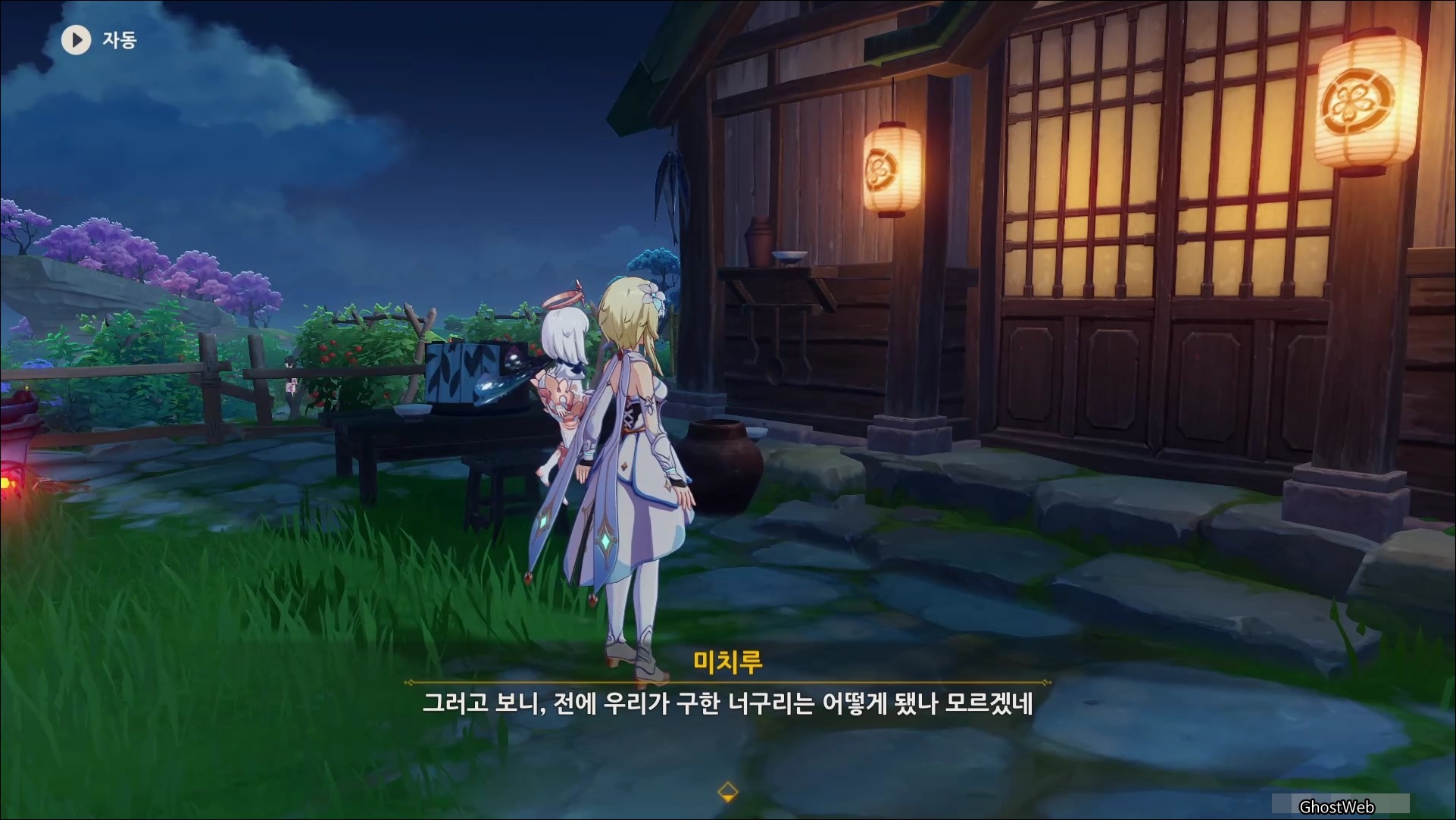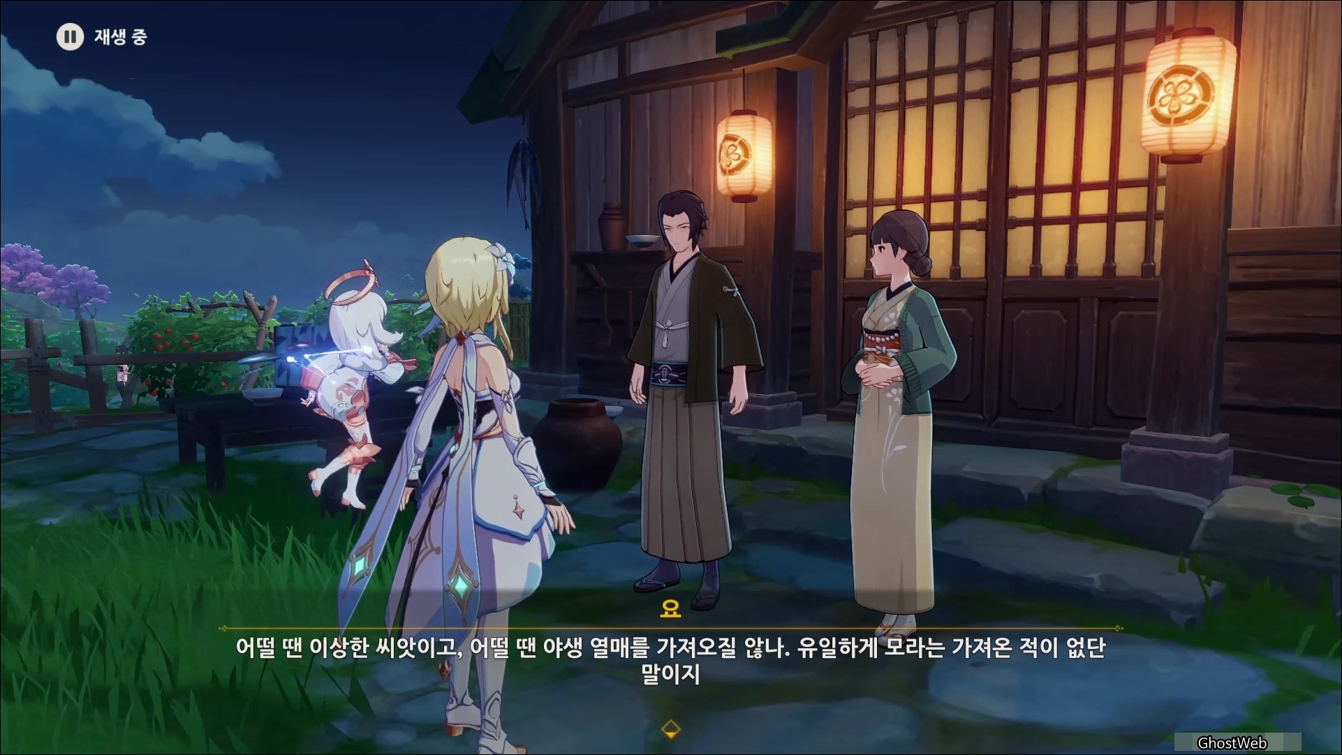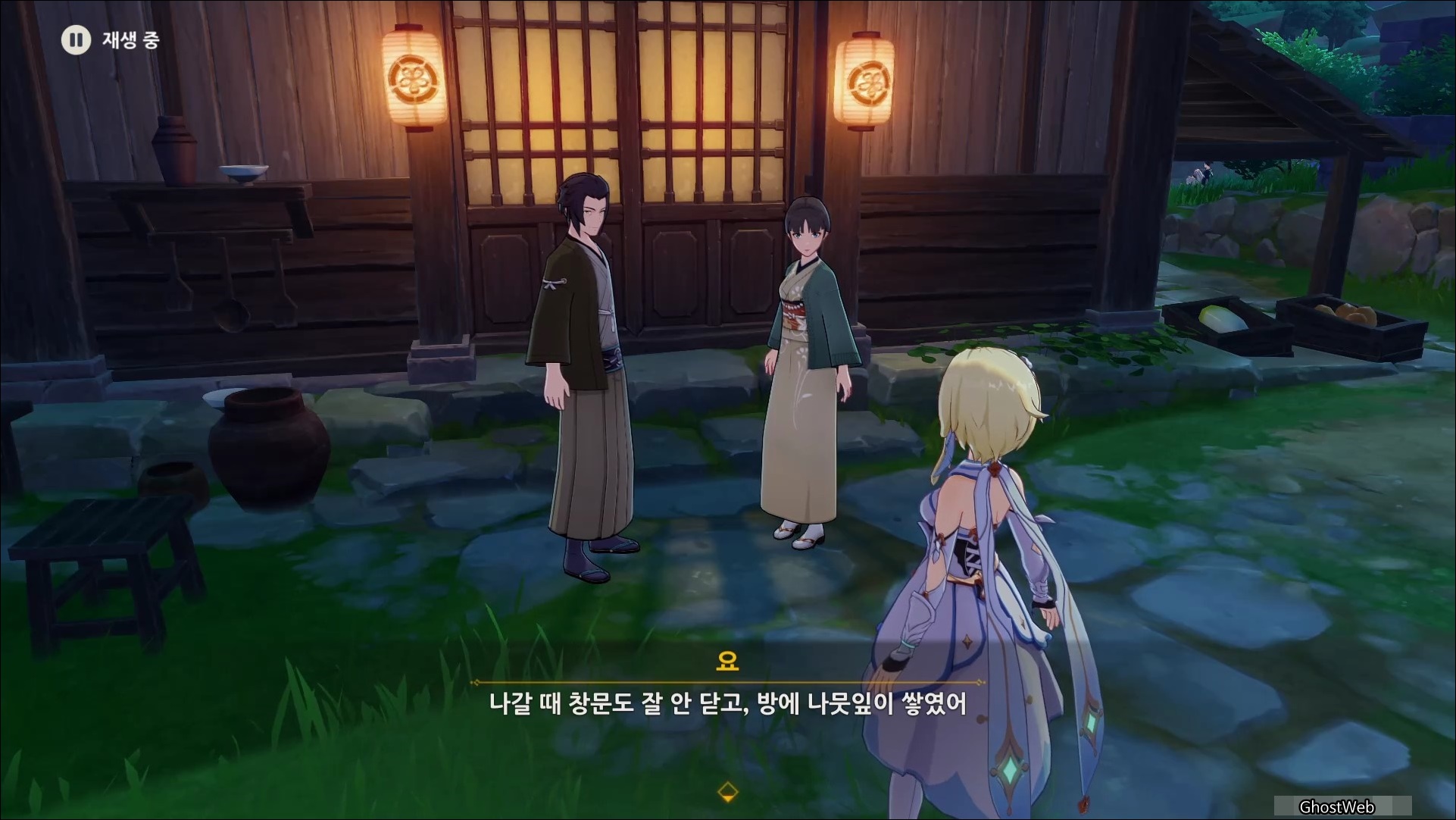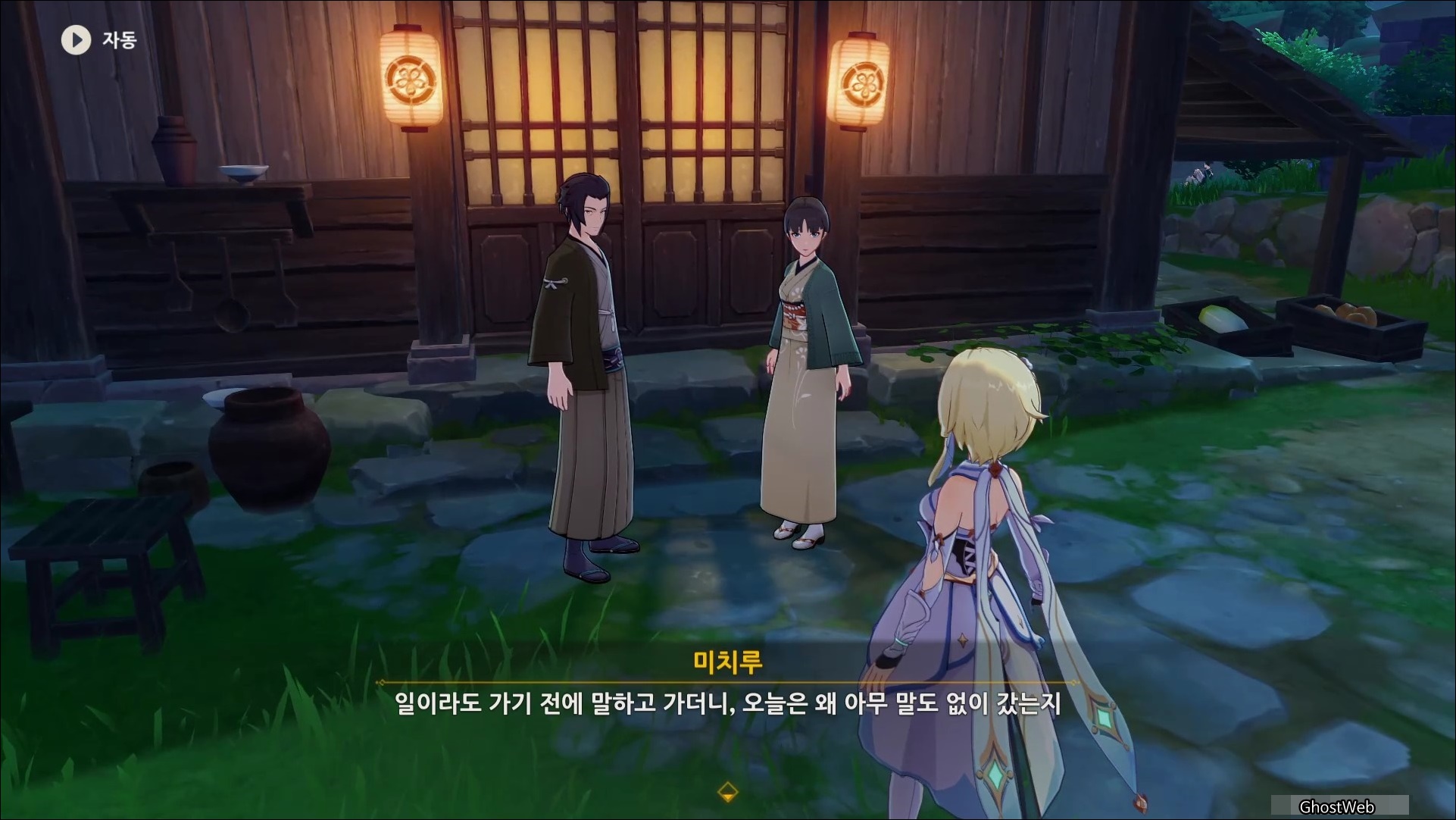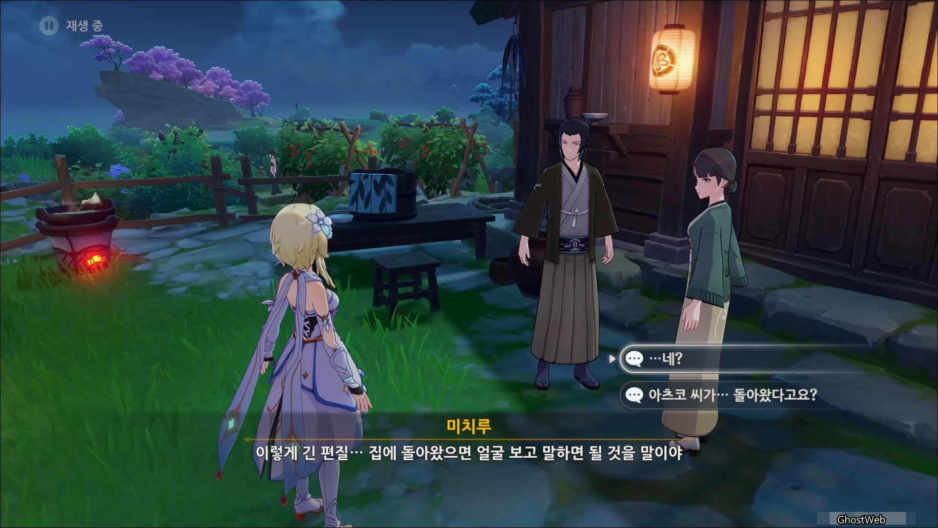 메뉴에서 <시간> 버튼을 눌러 시계 바늘을 해당 시간으로 변경하면 집 밖에서 아츠코 부모님의 대화를 통해 부부가 너구리를 구해준 이야기를 들을 수 있는데요.
