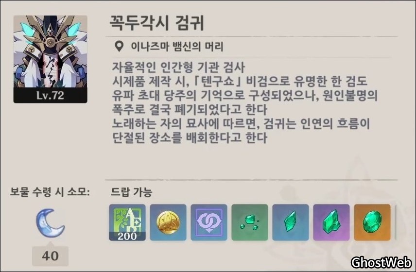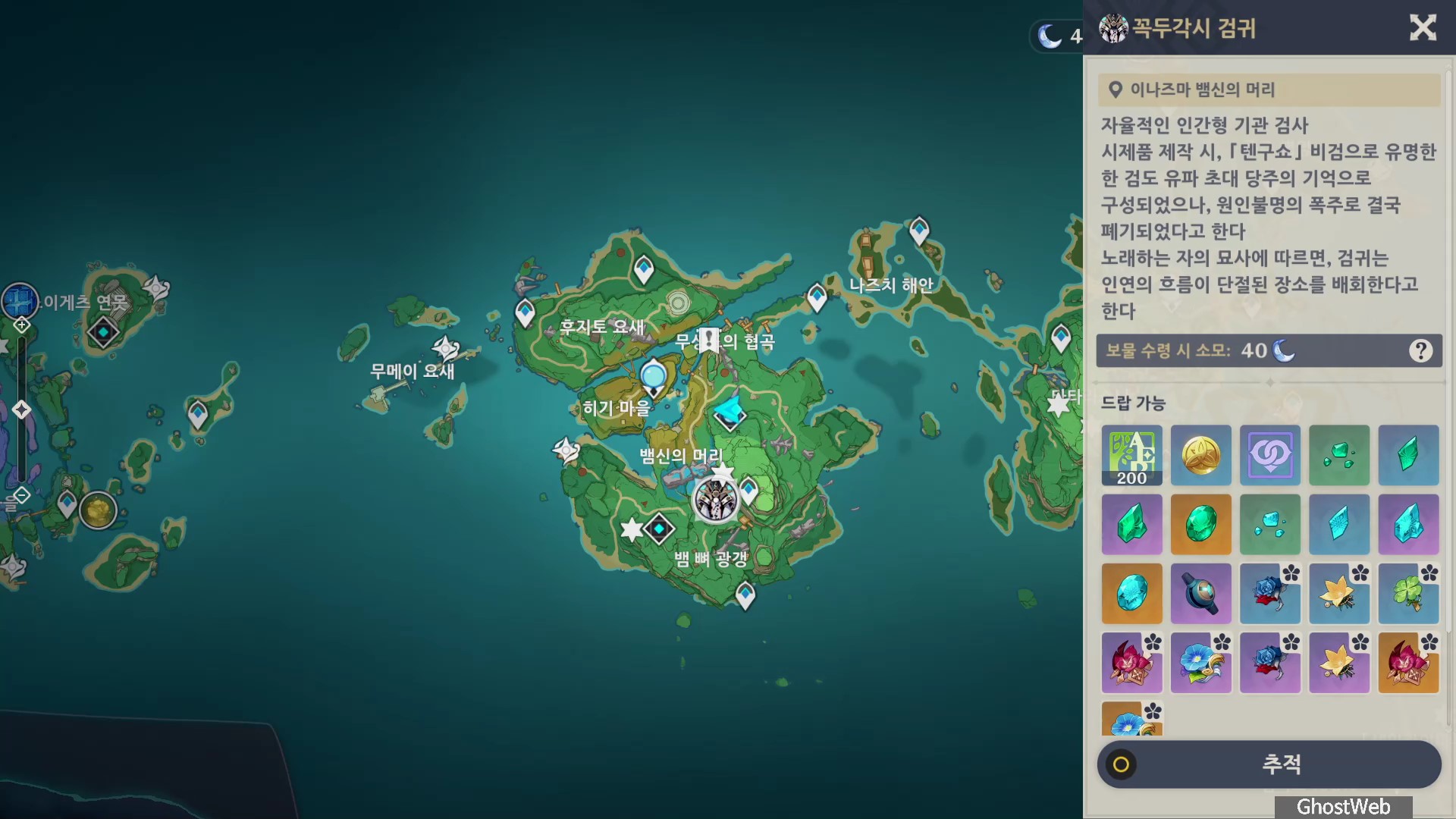 이나즈마 야시오리섬 뱀심의 머리, 뱀 뼈 광개 사이에 있는 꼭두각시 검귀에 도전하면 <카에데하라 카즈하>, <사유>의 캐릭터 육성 소재인 <꼭두각시 부품>을 얻을 수 있어요.