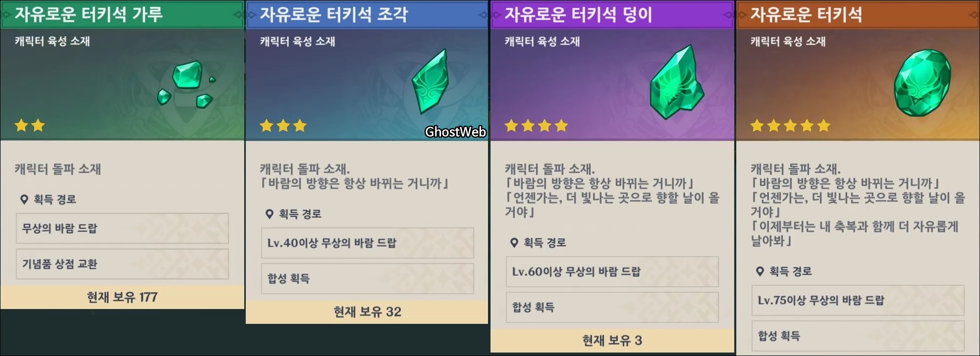 - 자유로운 터키석 가루, 자유로운 터키석 조각, 자유로운 터키석 덩이, 자유로운 터키석 (바람 원소 캐릭터 육성 소재)